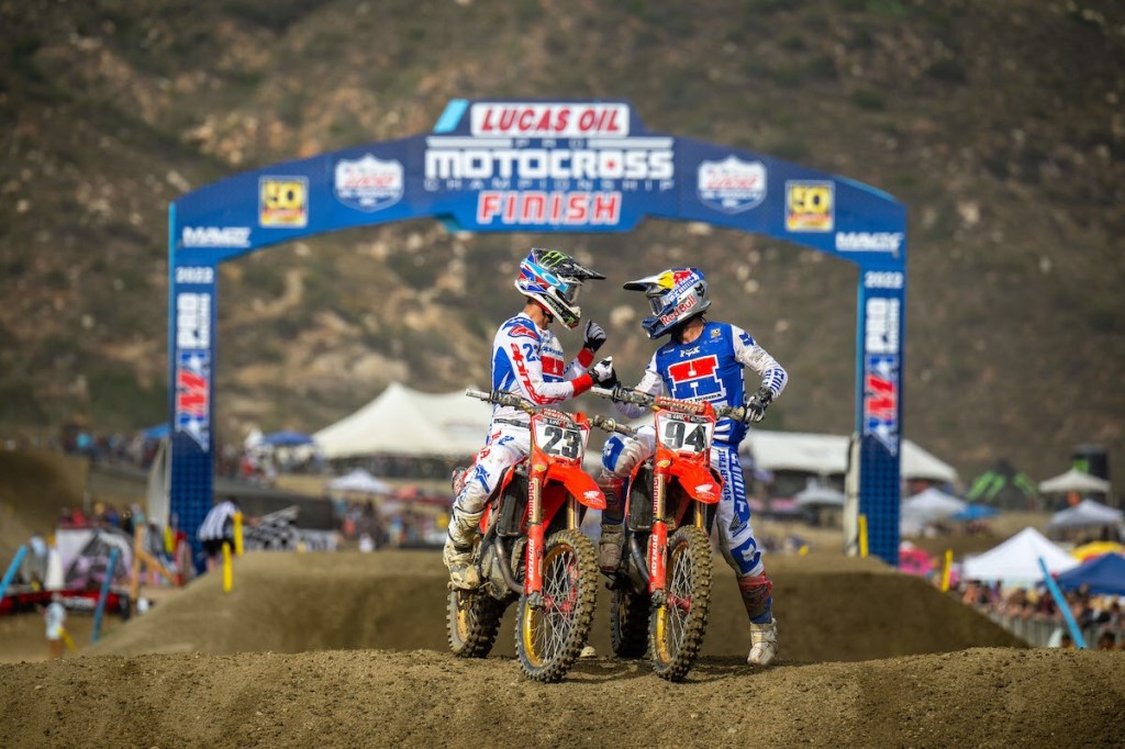 PALA, Calif. (May 28, 2022) – After weeks of anticipation, the 50th Anniversary of the Lucas Oil Pro Motocross Championship, sanctioned by AMA Pro Racing, officially kicked off with the Honda Fox Raceway I National, presented by Fox Racing, from Southern California’s Fox Raceway. Mostly cloudy skies and cool temperatures made for near-perfect race conditions, which resulted in a stellar afternoon of racing that saw the four-rider lineup for Team Honda HRC dominate all four motos across the 450 and 250 Classes. In the premier division, Chase Sexton posted the first 1-1 performance of his career, out-dueling teammate Ken Roczen, while Jett Lawrence kicked off his 250 Class title defense with a sweep of the motos, followed by his brother Hunter Lawrence in second.450 Class