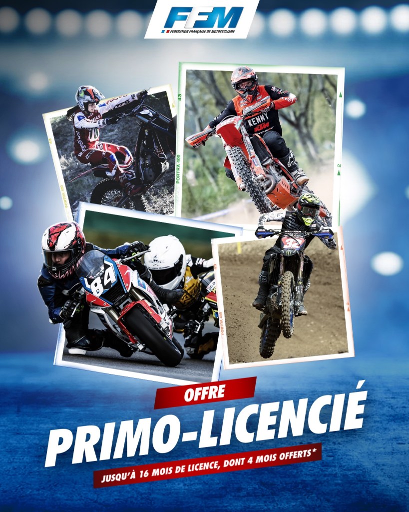La Fédération Française de Motocyclisme renouvelle à compter de ce jeudi 1er septembre son offre « Primo-licencié » permettant aux pratiquants de sport moto de bénéficier d’une licence annuelle compétition ou entraînement d’une validité de 16 mois, soit jusqu’à 4 mois offerts.