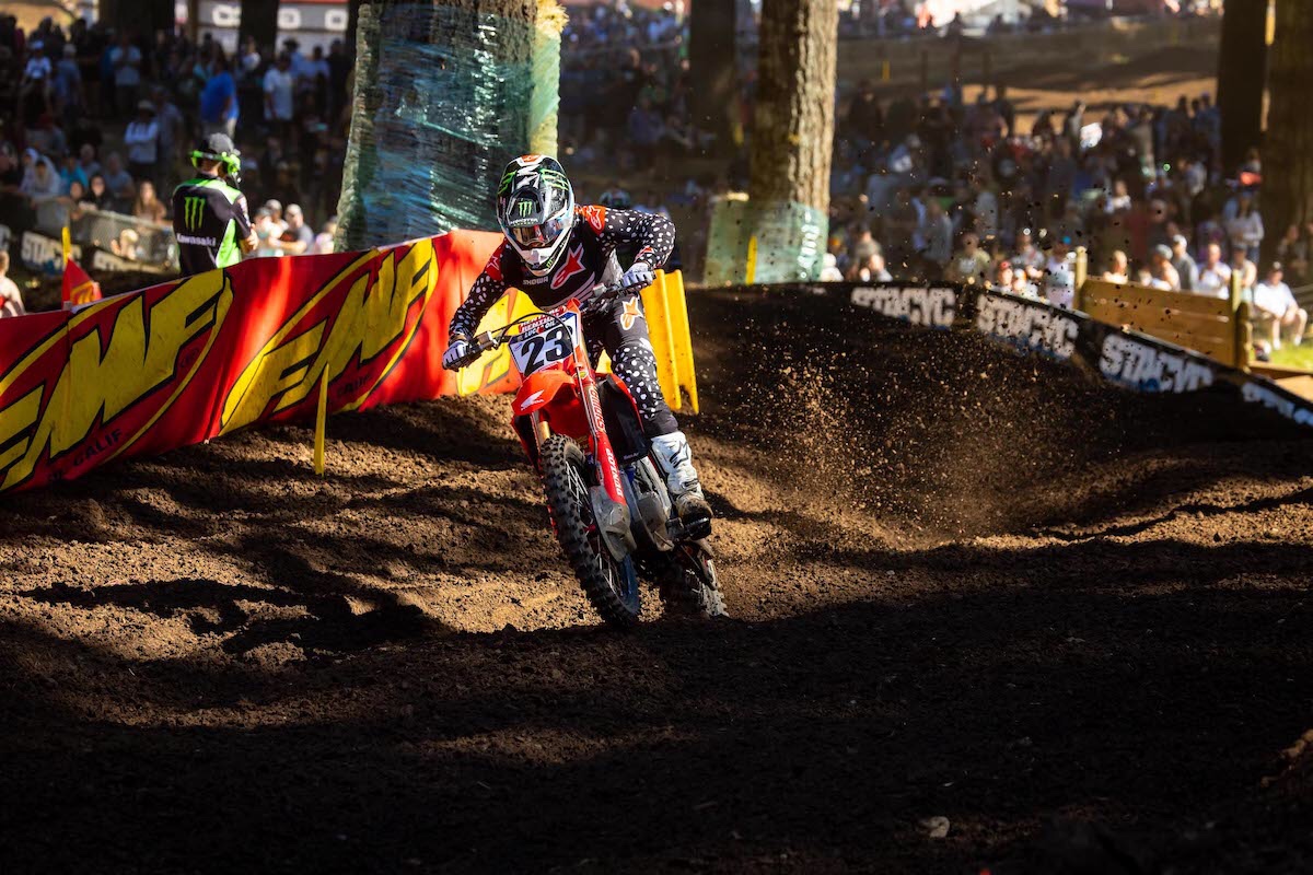 In the closing minutes Cooper picked up the pace to run his fastest laps of the moto, which fended off a late push from Lawrence. That turned the attention to Hunter Lawrence and his pursuit of Shimoda for third. With his chances for the overall win in the balance, Lawrence continued to make gains as both riders navigated through lapped traffic. Mere bike lengths separated the two riders as they took the white flag. Lawrence got close on multiple occasions, but couldn’t complete the pass.