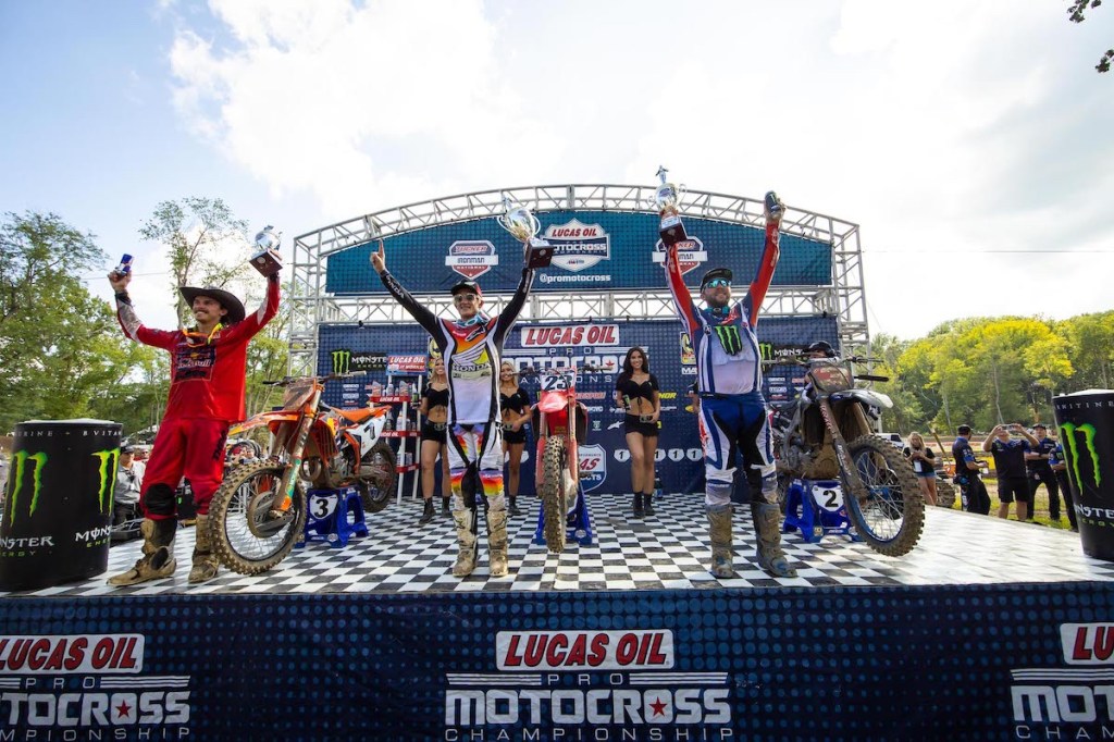 In trading moto wins, Sexton (2-1) and Tomac (1-2) finished tied atop the overall standings, but the second-moto tiebreaker gave the Honda rider his fourth victory of the season and his third win in the past four races. Tomac’s fourth straight runner-up finish extended his overall podium streak to 10 races, while Plessinger (3-3) earned his second podium result of the year.