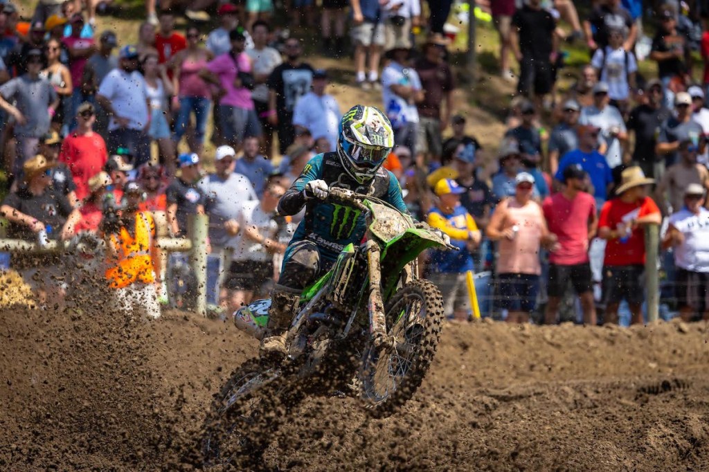 Back up front, the gap between first and second dropped to less than two seconds as Sexton navigated lapped riders, sometimes to Tomac’s benefit. As they approached the final five minutes of the moto Tomac closed the deficit to a second and had Sexton within striking distance. A bobble by Tomac halted his momentum briefly and allowed Sexton to pull back out to a three second lead. Behind this battle up front, Monster Energy Kawasaki’s Jason Anderson was on a charge through the field that saw him easily pass Plessinger for third.