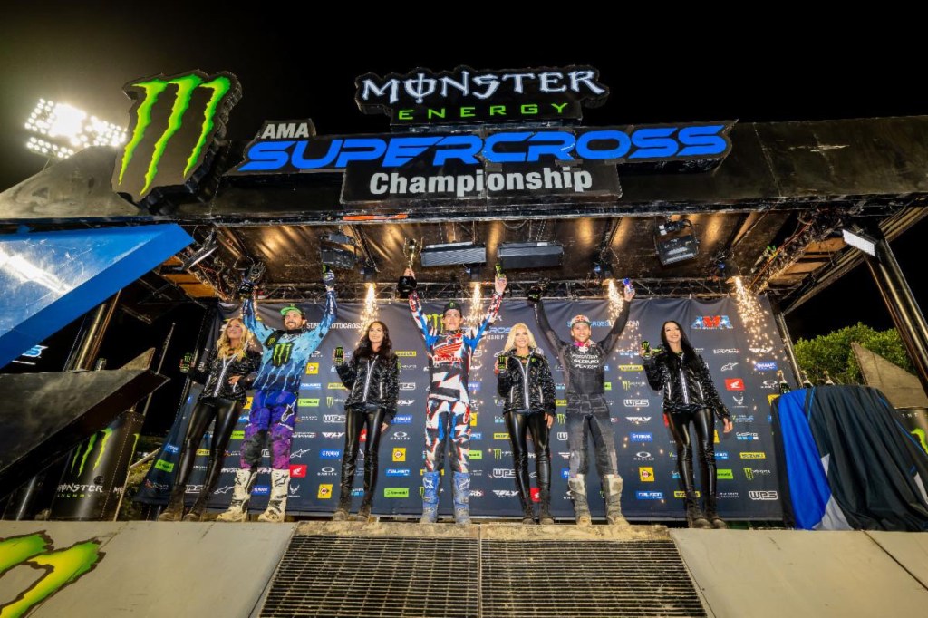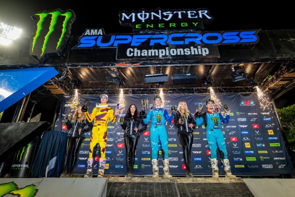 Monster Energy Kawasaki’s Jason Anderson, the 2018 Supercross Champion, earned the runner-up spot at the second race held at the Anaheim venue this year. Progressive Insurance ECSTAR Suzuki’s Ken Roczen nabbed the final spot on the podium and was the most consistent of the top racers. The Western Regional 250SX Class delivered a first-time winner when Monster Energy Yamaha Star Racing’s Levi Kitchen earned the 250SX Class win in only his fifth Supercross race.