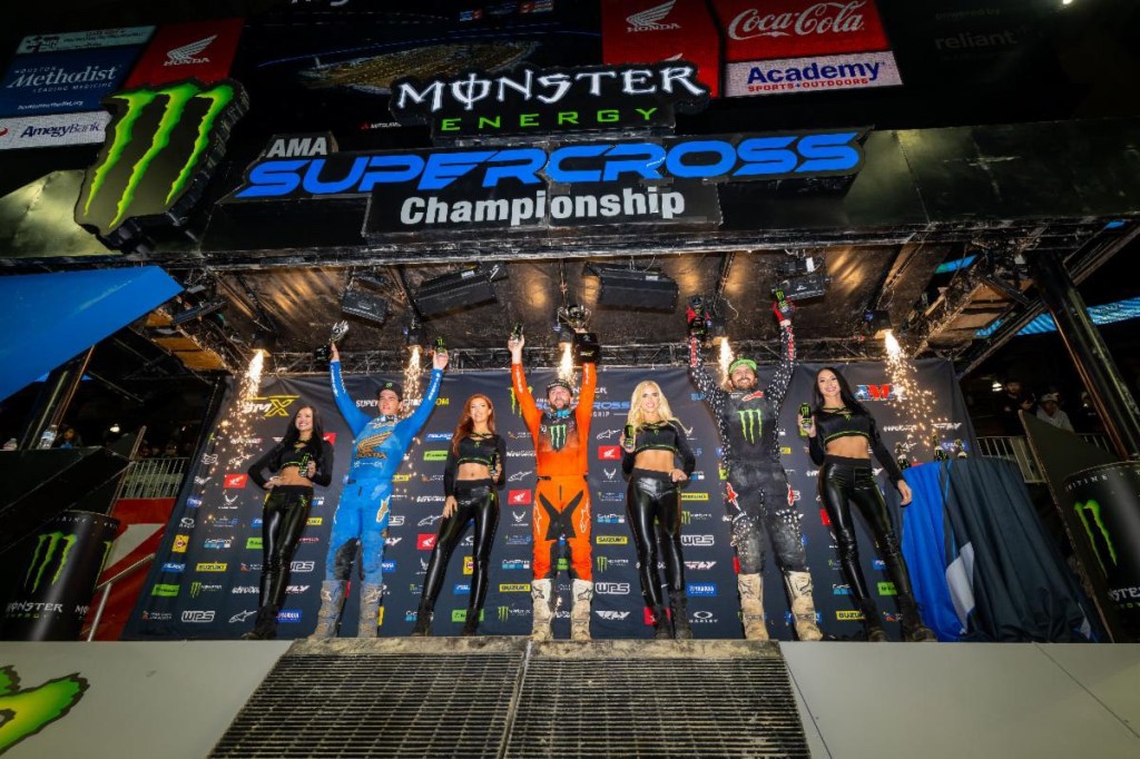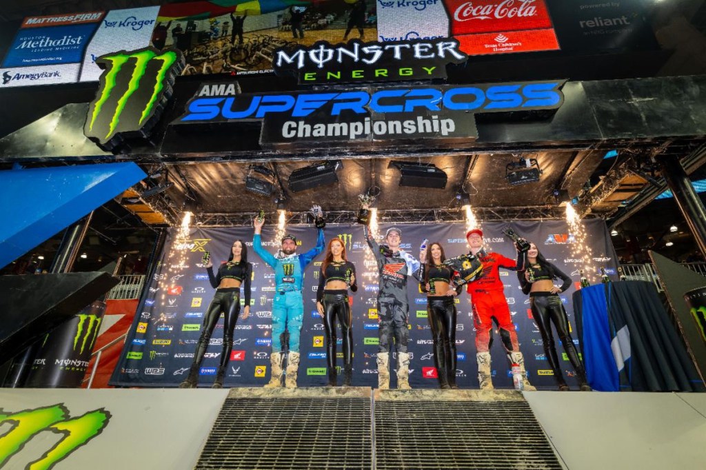Houston, Texas, (February 5, 2023) Monster Energy Yamaha Star Racing’s Eli Tomac returned to his winning ways, holding firm through a dramatic Round 5 of the 2023 Monster Energy AMA Supercross. Team Honda HRC’s Chase Sexton had the lead in his sights but had to settle for second inside NRG Stadium in Houston, Texas.