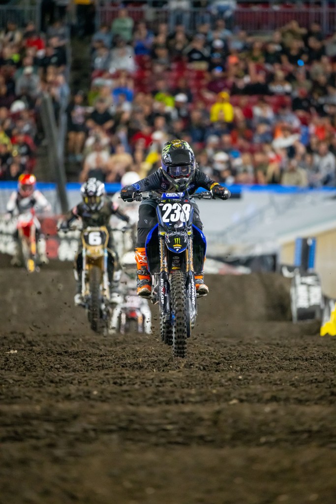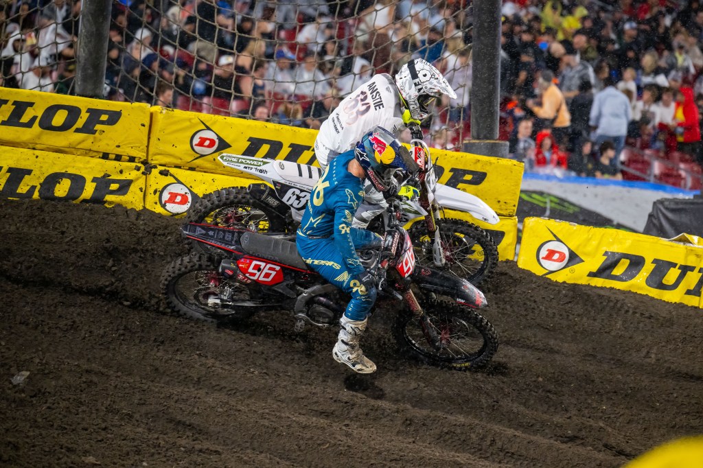 Up front Thrasher looked untouchable. Fire Power Honda’s Max Anstie held second place and rookie Monster Energy Yamaha Star Racing’s Haiden Deegan looked like a seasoned pro in third ahead of one of the class’ true seasoned pros, Troy Lee Designs Red Bull GASGAS Factory Racing’s Michael Mosiman. Behind all the action at the front, Lawrence was on the move slicing rapidly through the pack after a bad start. Less than six and a half minutes into the 15-minute plus one lap Main Event Lawrence cut under Mosiman, taking out his front wheel and dropping the GASGAS rider to the dirt. The move put Lawrence in third place and he quickly closed the distance to Anstie. With 5:47 on the race clock Lawrence took over the second place spot, but Thrasher was 5.9 seconds ahead.