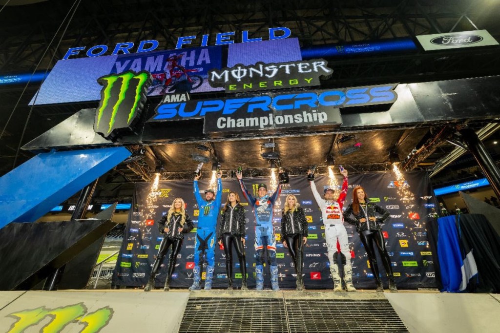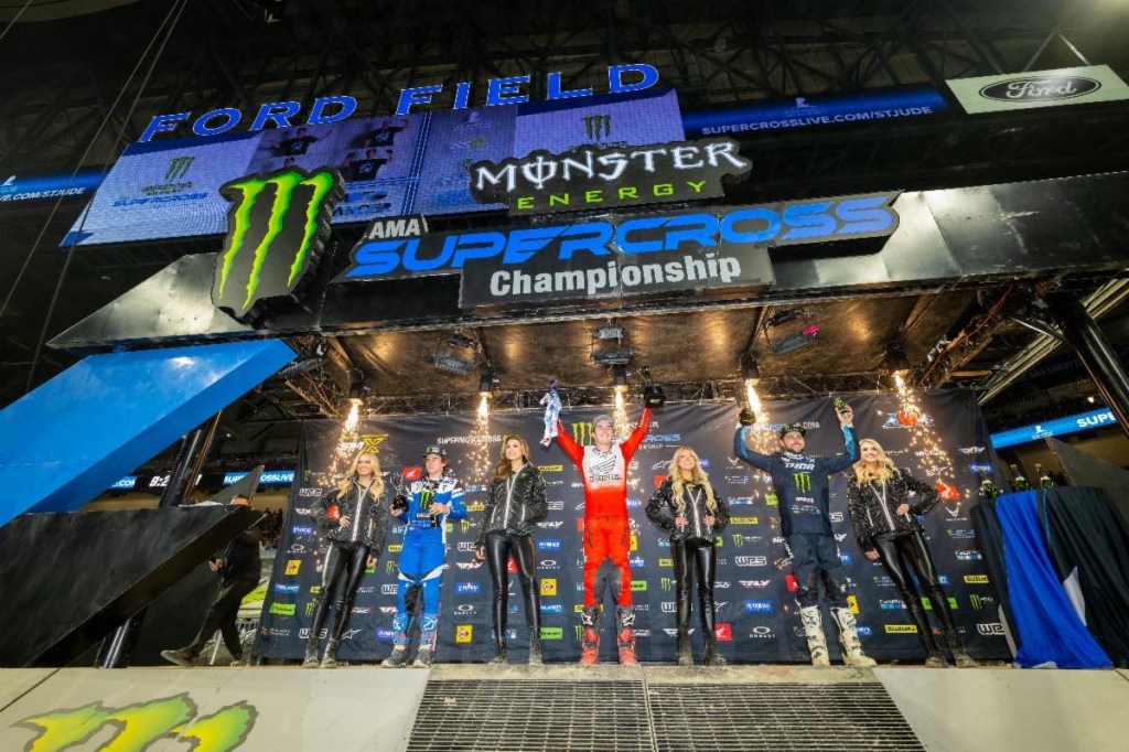 Red Bull KTM’s Cooper Webb earned second place after the on-track battles had been settled in front of 49,817 race fans at Ford Field in Detroit. Monster Energy Yamaha Star Racing’s Eli Tomac took home third place in a round that pays points for both the Supercross season and the inaugural SuperMotocross World Championship. In Round 6 of the Eastern Regional 250SX Class, Team Honda HRC’s Hunter Lawrence took his fifth win of the season.