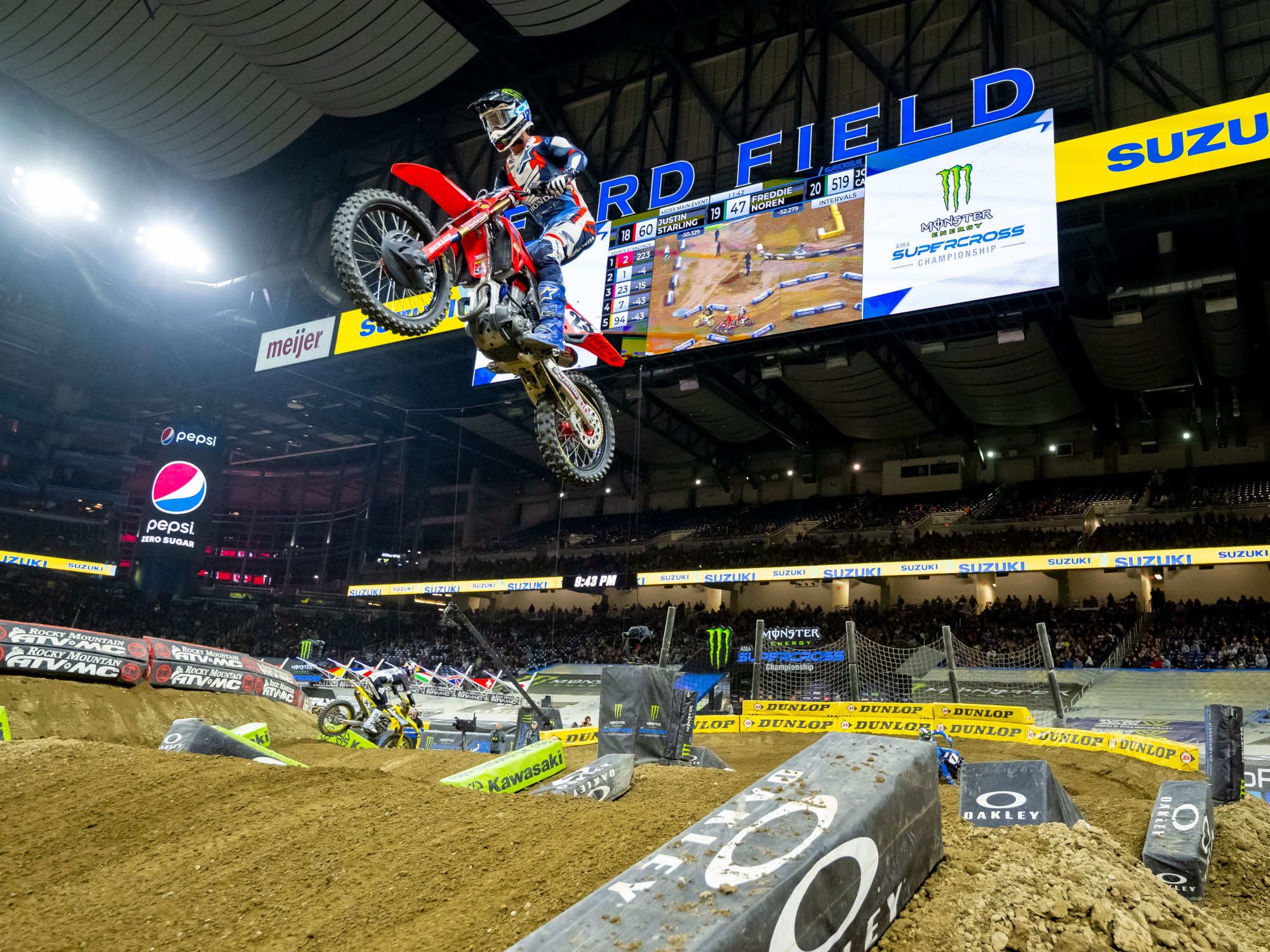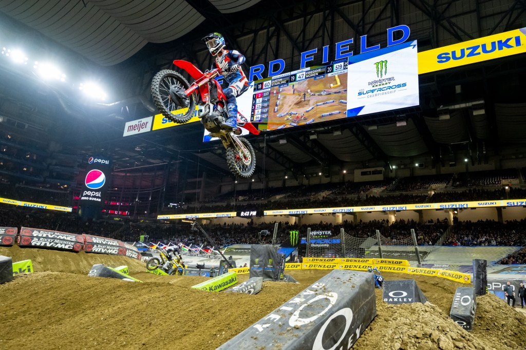 Detroit, Mich., (March 18, 2023) Team Honda HRC’s Chase Sexton won a Main Event filled with intense racing at Round 10 of the 17-round Monster Energy AMA Supercross indoor stadium season.