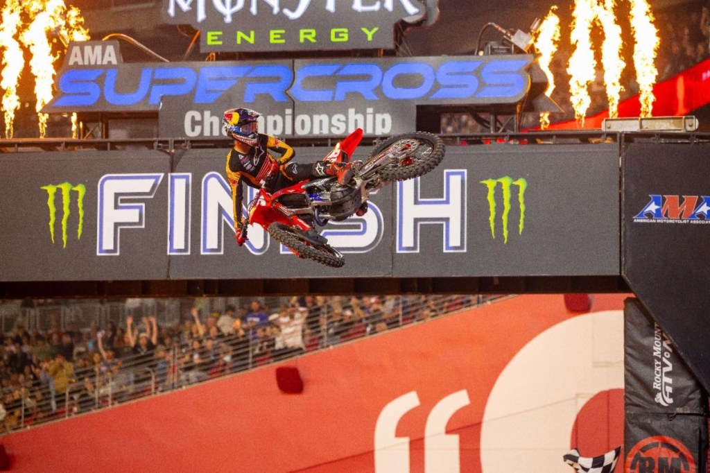 Team Honda HRC’s Chase Sexton earned second place points inside State Farm Stadium in Glendale Arizona with 4, 1, 3 race scores and with it earned the 2023 Triple Crown Championship – a secondary championship held within the Supercross season. Troy Lee Designs Red Bull GASGAS Factory Racing’s Justin Barcia finished third at the event that pays points not only into the Triple Crown and the 17-round Supercross season, but also toward the inaugural 31-round SuperMotocross World Championship. In Round 6 of the Western Regional 250SX Class, Team Honda HRC’s Jett Lawrence earned his first Triple Crown win and extended his points lead in that regional series.