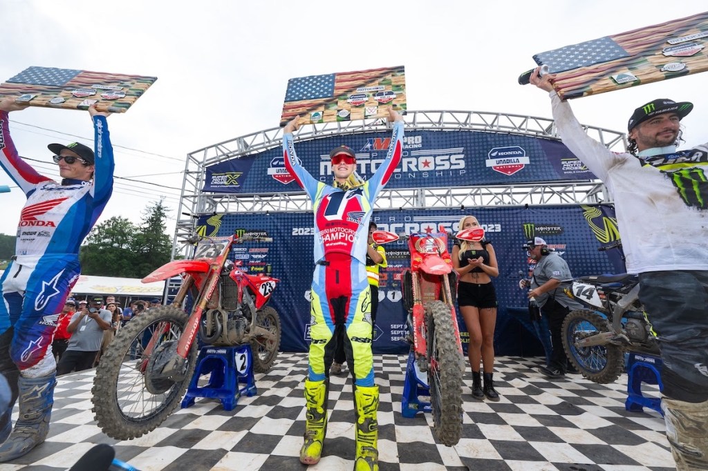 NEW BERLIN, N.Y. (August 12, 2023) – The three-round stretch run of the 2023 Pro Motocross Championship, sanctioned by AMA Pro Racing, got underway on Saturday from the hallowed grounds of Central New York’s iconic Unadilla MX. A championship atmosphere was in the air at the Honda Unadilla National as Australian rising star Jett Lawrence entered with a chance to wrap up the 450 Class title in his first summer of premier class competition. When all was said and done, Lawrence extended his perfect season for his ninth straight 1-1 performance to clinch the Edison Dye Cup with two rounds remaining. In the 250 Class, the elder Lawrence, Hunter, made it the sixth sweep for the family and Team Honda HRC, which extended his championship point lead and moved him one step closer to a maiden title.