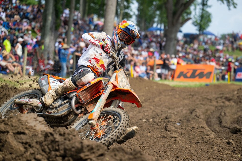 The first moto of the 250 Class saw Monster Energy/Pro Circuit/Kawasaki’s Ryder DiFrancesco lead the field to the MotoSport.com Holeshot ahead of the Red Bull KTM Factory Racing ride of Tom Vialle and the Monster Energy/Pro Circuit/Kawasaki duo of Seth Hammaker and Jo Shimoda. Deep in the field was championship point leader Hunter Lawrence, who started 17th aboard after being forced to avoid a crash in the first turn. The early adversity also impacted Lawrence’s primary title rival, Monster Energy Yamaha Star Racing’s Justin Cooper, who was one of several riders collected in the incident and forced to fight his way forward from well outside the top 20.