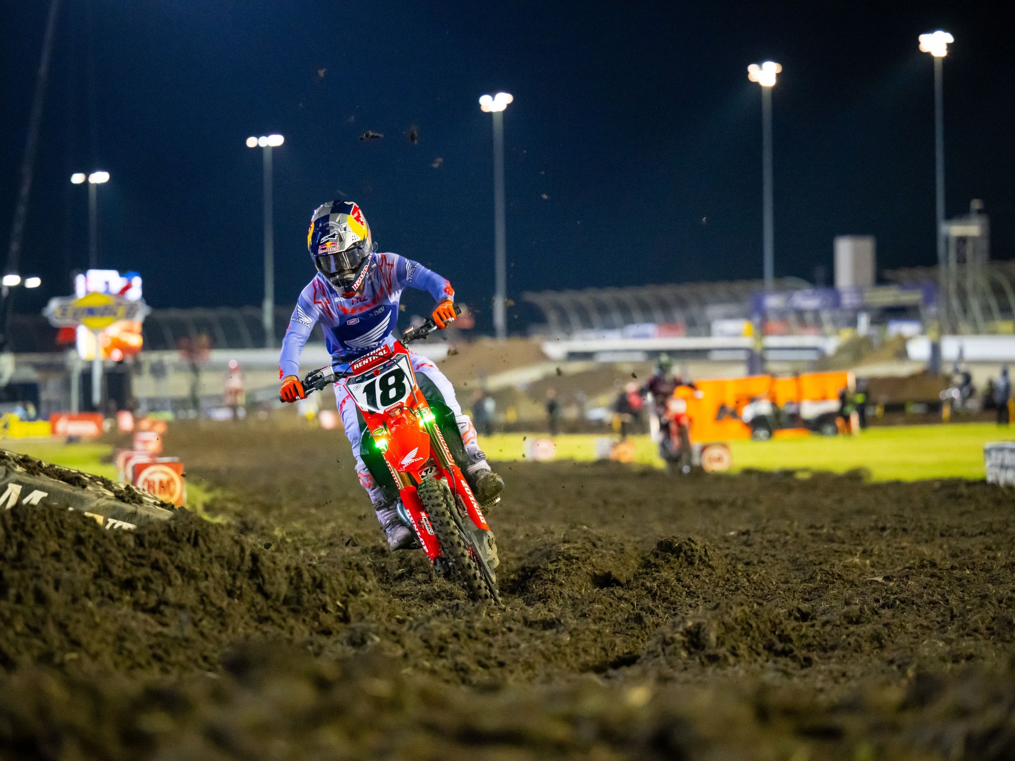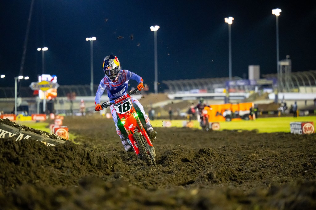 Progressive Insurance ECSTAR Suzuki’s Ken Roczen earned an emotional second place overall finish just days after the birth of his second child; the win moved Roczen into third place in points with a clear path to winning the championship next weekend. Team Honda HRC’s Chase Sexton earned third place overall on the high-speed, SuperMotocross track that stretched across the storied auto raceway. In the 250 Class, Team Honda HRC’s Hunter Lawrence was back on top, winning both motos and recapturing the 250 Class points lead.