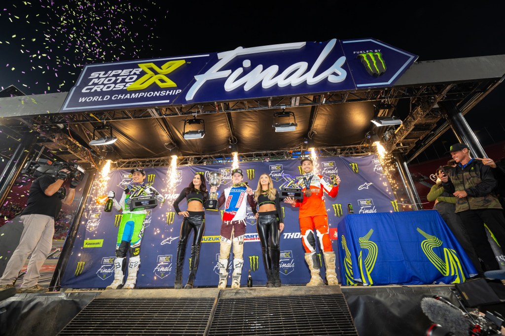 Chase Sexton grabbed the holeshot of the second 450 Class moto and with it put himself in the points lead for the title. He led Monster Energy Kawasaki’s Adam Cianciarulo, Jason Anderson, Cooper Webb, Jett Lawrence, and Ken Roczen. By the third corner, Lawrence was up into third place while Roczen worked on Webb in the early, tight racing. With just over two minutes off the clock in the 20-minute plus one lap moto, Roczen pushed his way into third place and the stage was set perfectly for the top three in points to settle the fight for World Champion. Sexton had pulled out more than a four second lead at the race’s midpoint, then made a dramatic mistake in the sand section; Sexton got leaned over going off a sand jump, landed hard, and was out of the race. It was then down to two, with Lawrence maintaining a lead over Roczen of just over one second. Roczen would close the gap in some parts of the track, but overall Lawrence maintained a small bit of breathing room. As the clock neared zero Roczen got held up by a lapper and dropped back three seconds. In the final two laps Roczen tightened the gap back up but never got in range to make a pass. Lawrence launched off the finish line double, setting of the winner’s pyrotechnics on the track and a string of fireworks around the legendary stadium. With 1-1 moto scores, Lawrence took the Final win and with it the SuperMotocross World Championship and its $1,000,000 bonus. Roczen earned second place in both the race and championship and pocketed $500,000 for himself, and Chase Sexton took third place in the championship and a $250,000 bonus. At the final event podium, it was Cooper Webb who stood third on the night with 5-3 moto scores and enough points to finish fourth in the championship and its $200,000 bonus.