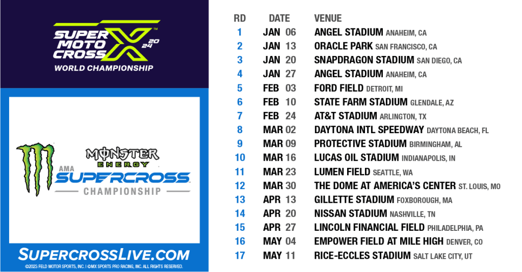 LOS ANGELES (September 22, 2023) – Feld Motor Sports, Inc. and MX Sports Pro Racing, Inc. announced today the 2024 schedules for the Monster Energy AMA Supercross Championship and Pro Motocross Championship, sanctioned by AMA Pro Racing. The indoor and outdoor seasons of the SuperMotocross World Championship series consist again of 17 Supercross races and 11 Pro Motocross races, providing 28 rounds of racing building towards the 2024 SuperMotocross Playoffs and World Championship Final. Supercross pre-sale begins Monday, October 3 at 10 a.m. ET for preferred customers and will run through the following Monday, October 9. Tickets for all Supercross and Pro Motocross races will then become available to the public starting on Tuesday, October 10 at 10 a.m. ET and then 10 a.m. in each subsequent time zone. New in 2024, all Pro Motocross event ticketing will be done through Ticketmaster. Fans can sign up for preferred access or make ticket purchases online atSupercrossLIVE.com andpromotocross.com.