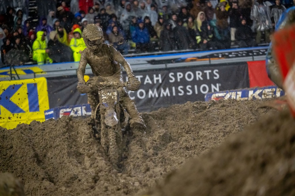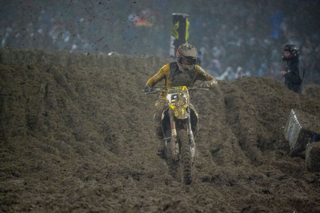 « It was tough. It was like, it started out really thick, and then it stayed thick enough even with all that water. A lot of times when it’s just pure rain the whole time it’s not too bad because the ruts don’t get super deep and you’re kinda just spraying it around. But this one… I went in [an inside rut] one time and got stuck for like a second or two. It was one of those tracks where it was just heavy dirt, super deep ruts. And then there was another time in the second rhythm section I almost looped out because I grabbed a handful of throttle and hung off the back. But this was one of the tougher ones. » – Eli Tomac, describing the conditions as some of the toughest he’s faced in supercross.