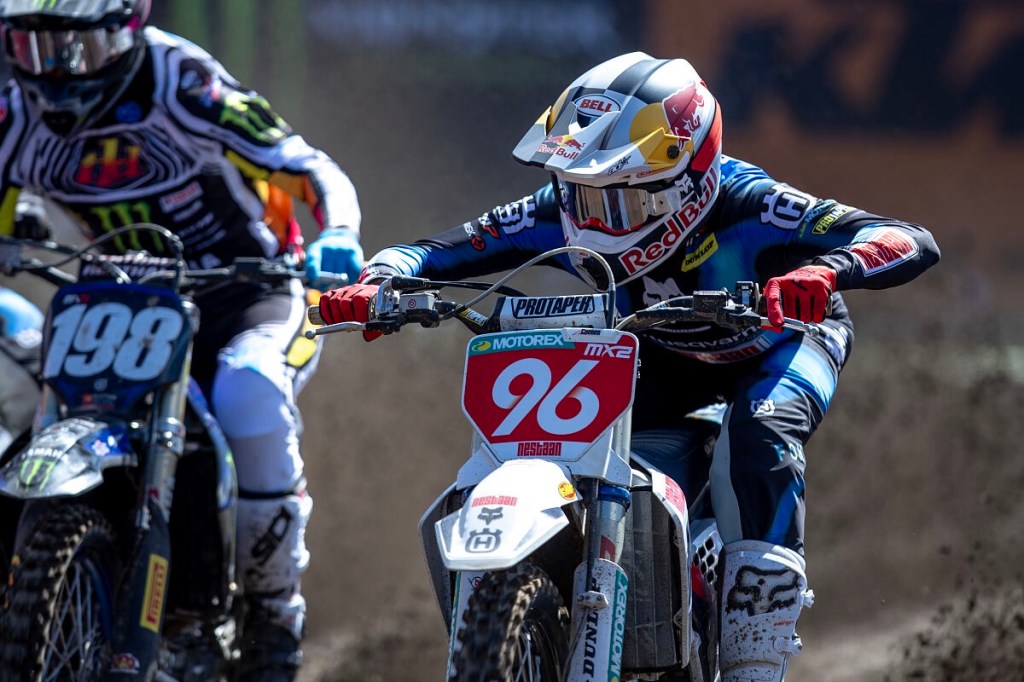 lors de la deuxième course, terminant juste derrière le champion du monde MX2 en titre, Andrea Adamo.
