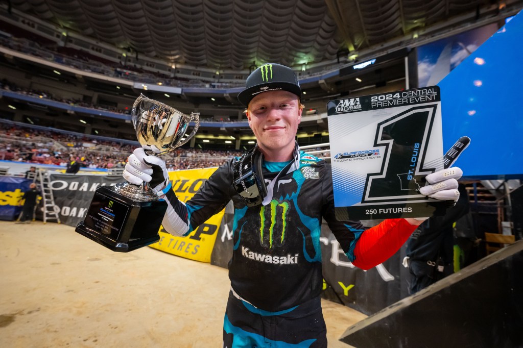 In the third SX Futures race, where top amateur racers compete for points toward their pro license, Monster Energy Kawasaki Team Green’s Drew Adams took back-to-back wins after his victory at the Daytona SX Futures round; Adams took the win just one day shy of his 16th birthday. Rockstar Husqvarna’s Landon Gibson finished in second place in the St. Louis single-race format event. Troy Lee Designs GASGAS’s Cole Davies took the final podium spot with a late-race pass for the position.