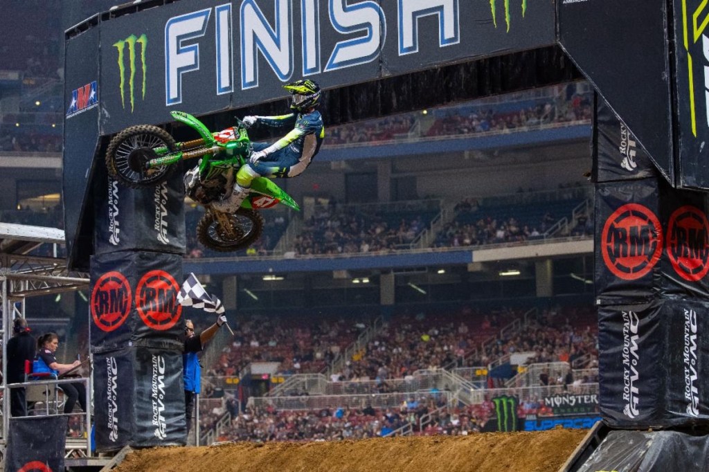 “That was insane. I mean, I’m pretty speechless right now. That was for Austin Forkner back home. I hope he’s healing up good. I know he’s the only other one to do that [sweep the 250SX Class Triple Crown], so yeah man, that was sick. Three good starts and then going into the last race – those lappers, I actually came together pretty bad with one right before the triple. And I if I would have missed the triple, RJ would have been right on me. So I had to send it – I still made it somehow. All in all though, man, what a day! Carrying the momentum from Seattle and I’m in a really good spot. I feel really good on the bike. Thanks to the whole Monster Energy Pro Circuit Kawasaki team, all my friends and family… This is pretty surreal so I’m going to soak this one in.” – Levi Kitchen