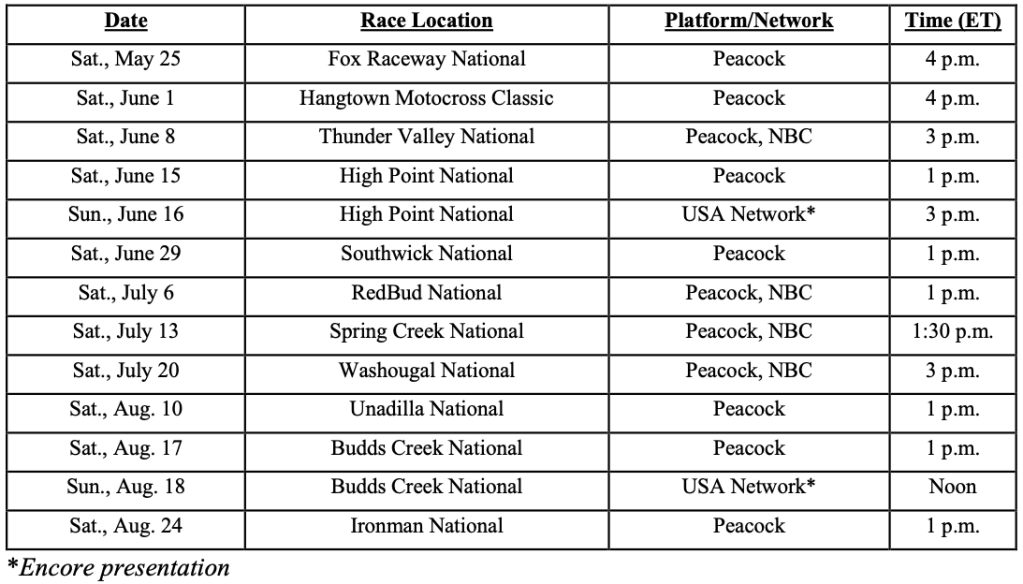 The 2024 Pro Motocross season begins with the Fox Raceway National in Pala, Calif., on Saturday, May 25, at 4 p.m. ET exclusively on Peacock.