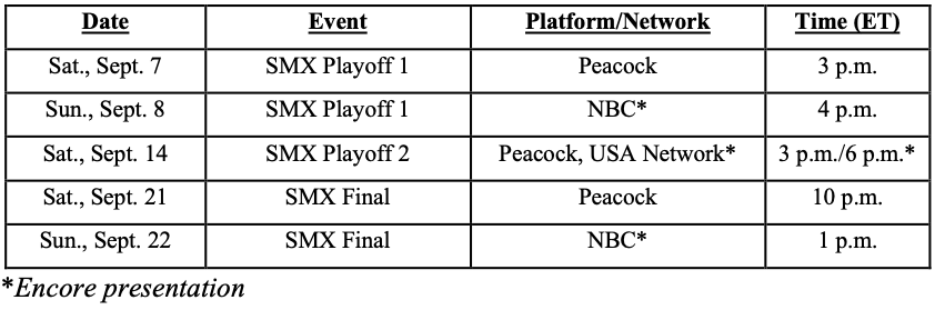 15-Time AMA Champion Ricky Carmichael, Seven-Time AMA Champion James Stewart, and Leigh Diffey Headline 2024 Commentary TeamSTAMFORD, Conn. – Dec. 20, 2023 – NBC Sports, Peacock, and the SMX League announced the 2024 SuperMotocross World Championship (SMX) broadcast and streaming schedule, including the Monster Energy AMA Supercross Championship and Pro Motocross Championship, sanctioned by AMA Pro Racing. All 31 rounds across the series, including exclusive live coverage of qualifiers, heats, Main Events and Motos will be presented on Peacock, NBC, USA Network, CNBC, and NBC Sports digital platforms.