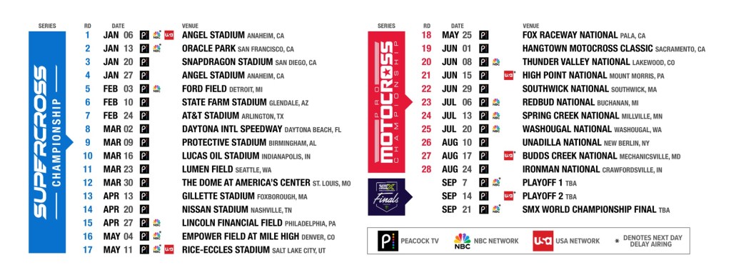 NBC Sports’ 2024 SuperMotocross World Championship coverage begins in under a month with the Monster Energy Supercross season opener from Angel Stadium in Anaheim, Calif., live on Saturday, Jan. 6, at 8 p.m. ET on Peacock and USA Network. An encore presentation will air the following day on Sunday, Jan. 7, on NBC at 2 p.m. ET and on Sunday, Jan. 8, on CNBC at 1 a.m. ET. CNBC will air a next-day encore for all 31 rounds across the series in 2024.
