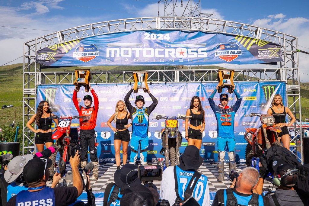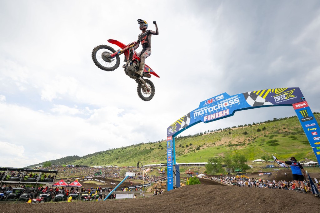 LAKEWOOD, Colo. (June 8, 2024) – The Pro Motocross Championship, sanctioned by AMA Pro Racing, traveled to the Rocky Mountains for Round 3 of the 2024 season, with an early test in the mile-high altitude of Thunder Valley Motocross Park, which sits mere minutes from downtown Denver. The landmark 20th running of the Toyota Thunder Valley National saw a variety of weather conditions, from abundant sunshine to rain and wind gusts, which resulted in another captivating afternoon of action. One week after a big crash ended his undefeated 450 Class record, Team Honda HRC’s Jett Lawrence outdueled his brother Hunter to capture a bounce-back win and re-establish himself in the early season title fight. In the 250 Class, Monster Energy Yamaha Star Racing’s Haiden Deegan continued his winning ways and emerged triumphant once again to open the summer with three straight victories.