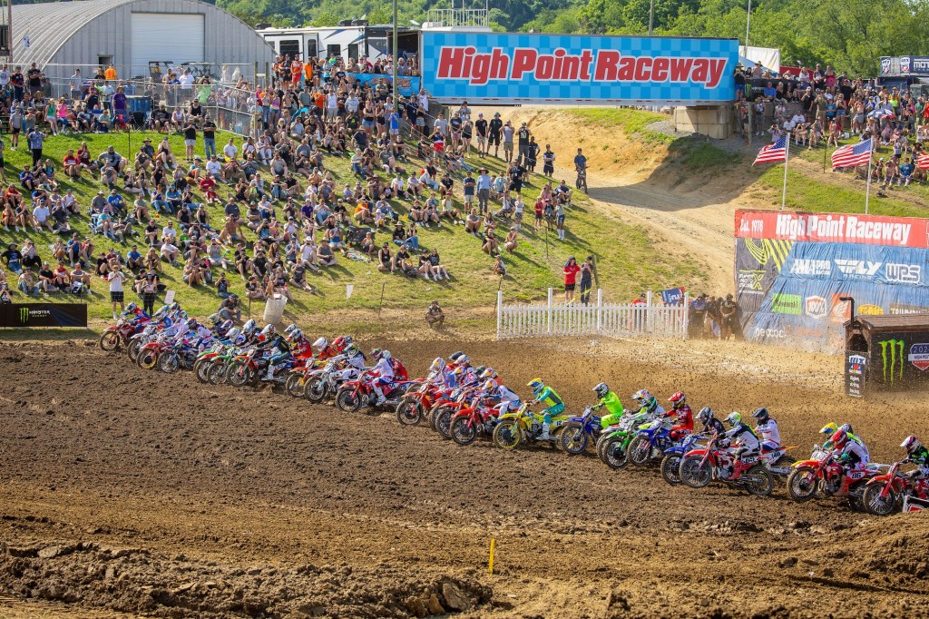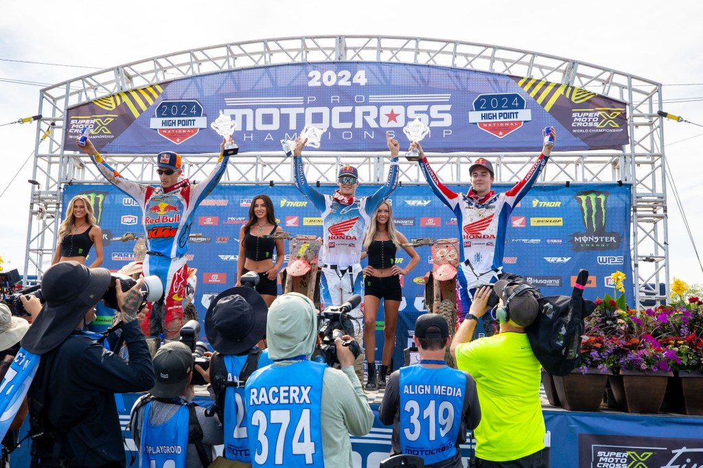 MT. MORRIS, Pa. (June 15, 2024) – An evening of scattered thunderstorms gave way to picture-perfect weather conditions and an ever-changing racetrack on Saturday as the Pro Motocross Championship, sanctioned by AMA Pro Racing, kicked off its East Coast swing with the annual Father’s Day weekend tradition from legendary High Point Raceway. The 47th running of the High Point National Presented by Sustainable Yard Management represented Round 4 of the 2024 season, where the “Country Club of Motocross” welcomed a massive crowd that saw reigning 450 Class Champion Jett Lawrence pilot his Team Honda HRC machine to a 1-1 effort for his third win of the season. In the 250 Class, Monster Energy Pro Circuit Kawasaki’s Ty Masterpool prevailed with a breakthrough maiden victory that also signified an unprecedented 300th victory for the most successful team in the history of the sport.