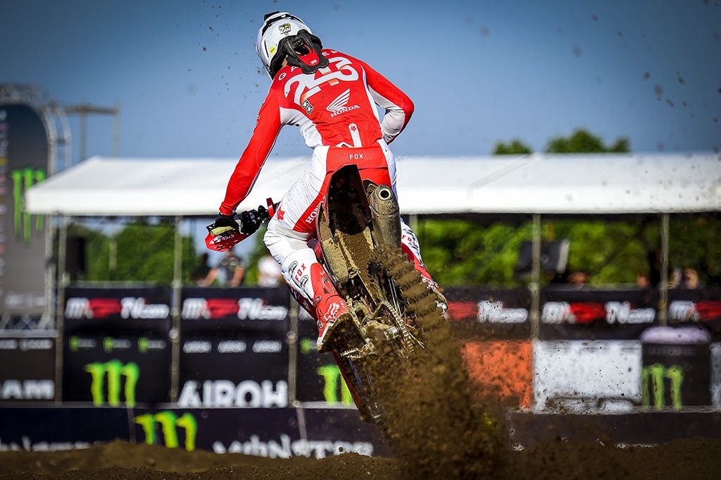 Brian Bogers grabbed third for Fantic Factory Racing, but landed short on the big triple jump at the top end of the circuit and although he didn’t crash, the Dutchman immediately pulled off the circuit and back to the pits. We wait for information on what went wrong in the end. Simultaneously, Mattia Guadagnini crashed on the same jump and was lucky to not get hit by riders behind him! He went into the pits so that his Nestaan Husqvarna Factory Racing mechanics could help to straighten out the bike.