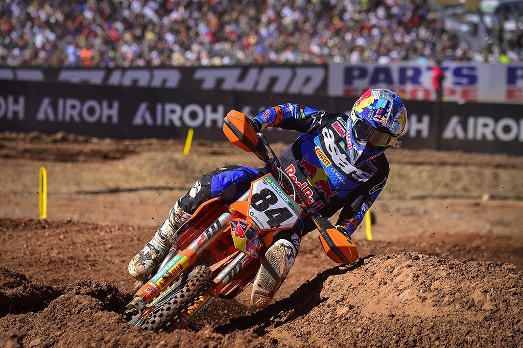 Prugnieres held on for an MX2 career-best fourth place finish, ahead of the Triumph riders, as Camden McLellan took fifth ahead of Haarup after the Dane fell with three laps to go, but picked it back up in time to hold sixth ahead of Karlis Reisulis for Monster Energy Yamaha Factory MX2.
