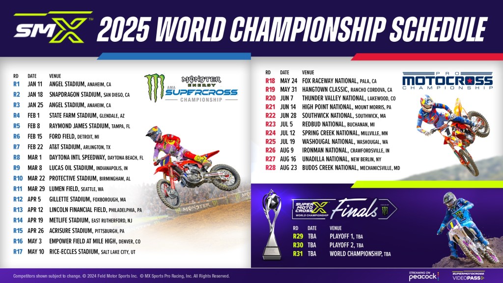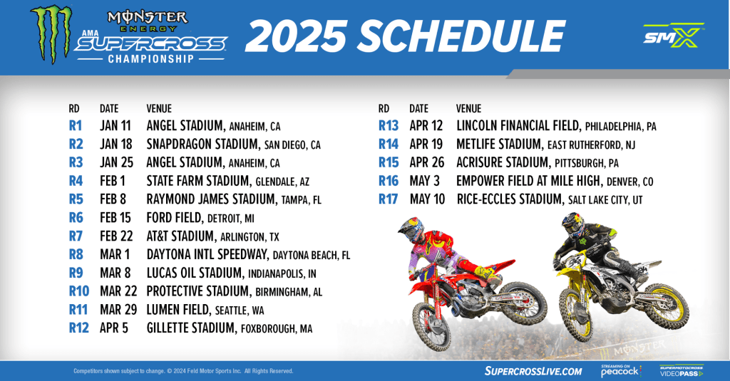 ELLENTTON, Fla./MORGANTOWN, W Va., (September 26, 2024) – Feld Motor Sports, Inc., and MX Sports Pro Racing, Inc. announced today the 2025 schedules for the Monster Energy AMA Supercross Championship and Pro Motocross Championship, sanctioned by AMA Pro Racing. The indoor and outdoor seasons of the SuperMotocross World Championship Series consists of 17 Supercross races and 11 Pro Motocross races, providing 28 rounds of regular season competition building towards the postseason and the 2025 SuperMotocross World Championship Finals, fueled by Monster Energy.