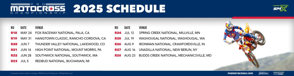The season will begin, as it always does, over Memorial Day weekend, where Southern California’s Fox Raceway at Pala will kick off the summer on Saturday, May 24, with the Fox Raceway National. From there, the championship journey will travel to Northern California’s Prairie City SVRA for the storied Hangtown Motocross Classic on May 31, followed by the mile-high altitude of Colorado’s Thunder Valley Motocross Park for the Thunder Valley National on June 7, before heading east for the famed Father’s Day tradition of the High Point National on June 14 from Pennsylvania’s High Point Raceway.