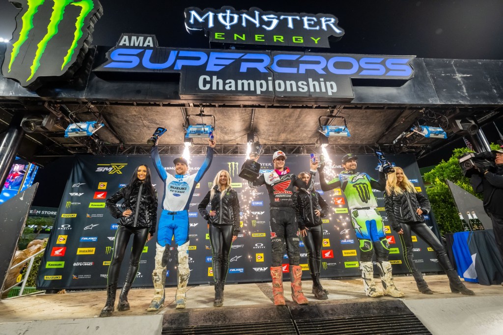 In 250SX Class racing, Haiden Deegan grabbed the holeshot with Red Bull KTM Factory Racing’s Julien Beaumer in second. Beaumer made an aggressive pass attempt in the second corner that brought the two racers together for the second time that night. Deegan held the lead and quickly pulled out a cushion to never be challenged again even as heavy rain came down late in the race. Monster Energy Yamaha Star Racing’s Cole Davies earned his first professional podium in just his third professional Supercross race; it came courtesy of a last lap mistake from Triumph Racing’s Jordon Smith who was challenging for the second-place spot when he crashed in the whoops. The 250SX Class podium consisted of three teenagers; it was the first all-teen podium since 2011. Team Honda HRC Progressive’s Jo Shimoda, winner of the season opener, put in a steady ride, despite having two broken fingers, to move from 10th place up to 6thplace at the checkers.
