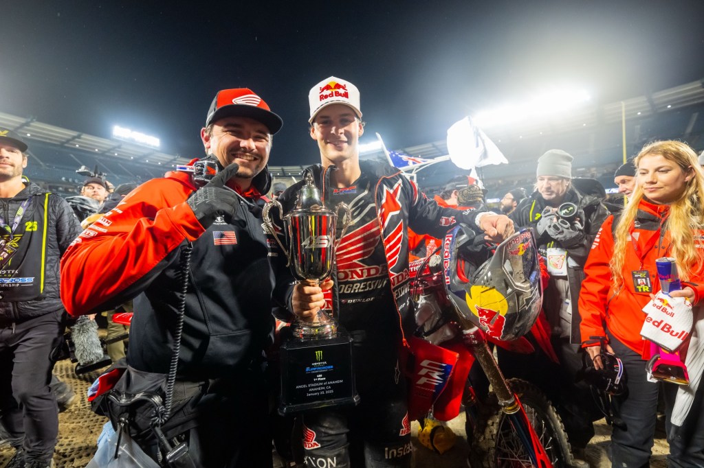 Anaheim, Calif., (January 25, 2025) Team Honda HRC Progressive’s Jett Lawrence took an impressive win amid wet track conditions inside Angel Stadium in Anaheim, California. It was the defending Monster Energy AMA Supercross and SMX World Championship™ champ’s first win of the season, and it was a thriller with four to five racers battling for the lead for much of the race.