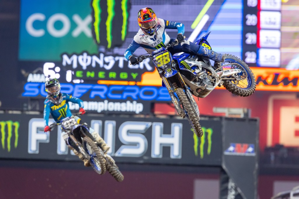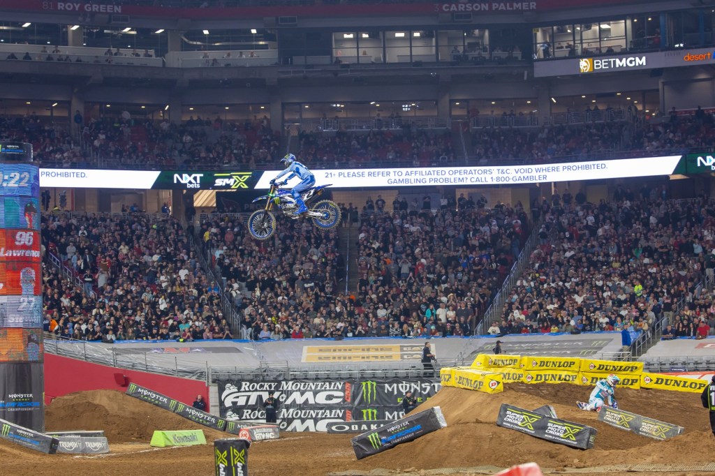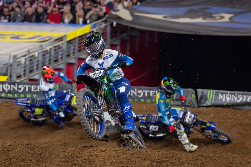 Monster Energy Yamaha Star Racing’s Cooper Webb grabbed his second podium of the season after starting the night with a win in Race 1. Webb’s Race scores of (1-5-3) were good for second overall. The red-plate holder coming into Glendale, Progressive Insurance ECSTAR Suzuki’s Ken Roczen earned a victory in Race 2 and rounded off the podium with third place overall and (4-1-5) Race scores. Monster Energy Yamaha Star Racing’s Eli Tomac won Race 3 and took fourth overall with (6-4-1) finishes. Defending Monster Energy Supercross Champion and Reigning SMX World Champion Team Honda HRC Progressive’s Jett Lawrence was in a good position entering Race 3, but a dab on the ground ended his night at the second corner with a (2-2-DNF) for eighth overall. After the race his team reported that he’d felt a strong, unfamiliar pain in his knee and pulled off; it was unclear what this means, but there was optimism that he’ll be back on the track at the next round. In the Western Regional 250SX Class, the sport’s history books were opened up and Triumph added its name to the winner’s list thanks to Triumph Racing’s Jordon Smith’s fast and consistent (2-3-1) Race performances and the overall 250SX Class victory.