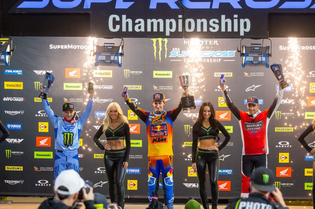 “It’s unbelievable to get the first win for the Triumph brand… It feels good to be up here and get the win. The track got very tricky. [The track crew] didn’t touch those whoops since this morning so they were treacherous, but it’s just unbelievable to get this win. The bike is amazing. I think a lot of people may have questioned me leaving Star, but I believed in these guys from day one and we worked our butts off all [during the] off-season and it really shows. I’m just so happy to be back up here on the top step.” – Jordon Smith