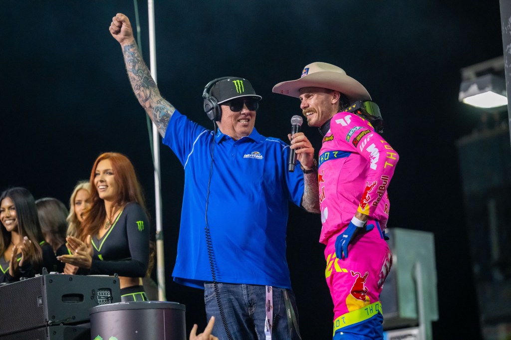 “It’s special. I lost my dad a few months ago and this was his race. Growing up as a kid, this is where I came with him. It was the only Supercross I came to. And he was with us today. Some guy came up to me in the pits and had his old jersey that he raced with back in the day, that was something I never had. He gifted me that and – it just felt different today, man, like my dad was definitely here… Finally got to burn one [a victory burnout on the banked track] down here in Daytona, that was for my dad, for sure.” – RJ Hampshire, alternatingly poignant and joyous on the podium.
