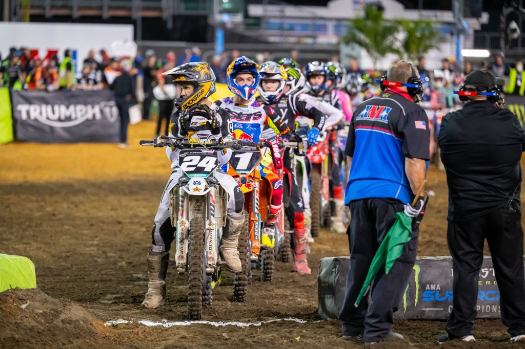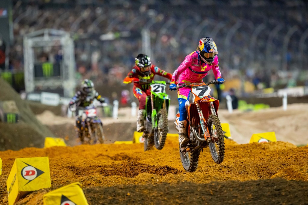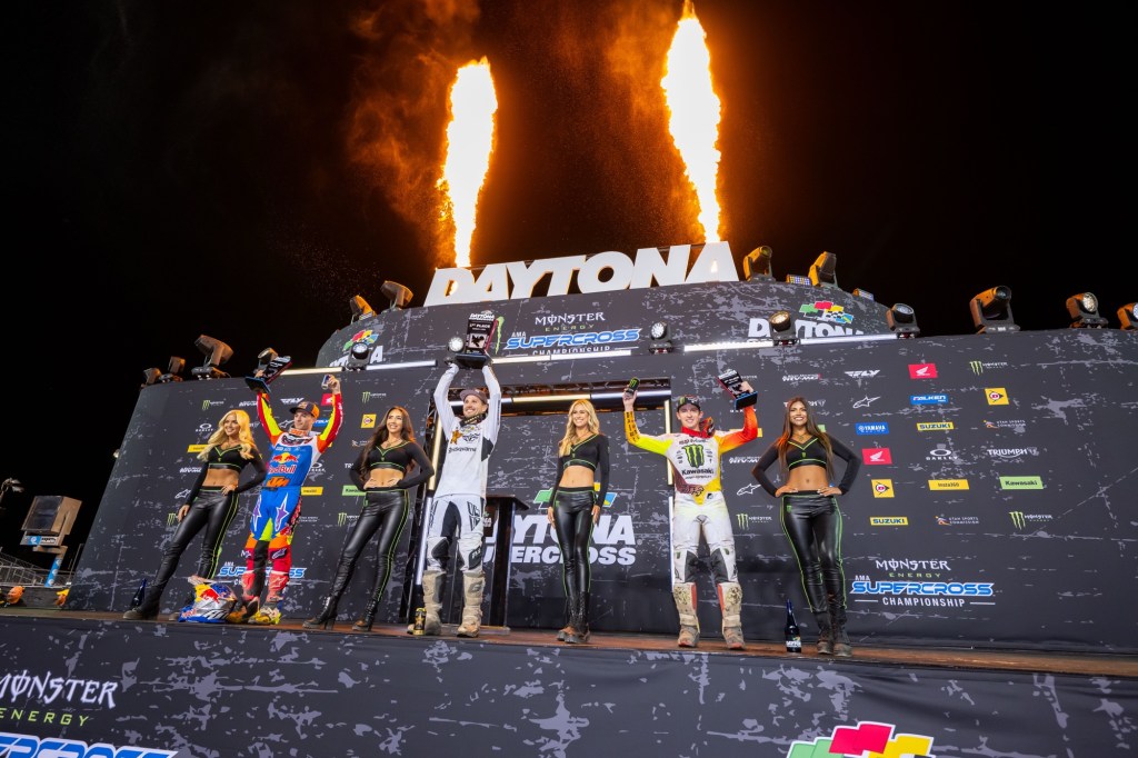 In 250SX Class racing, RJ Hampshire fought hard to capture an emotional first win at Daytona. Red Bull KTM Factory Racing’s Tom Vialle captured the Holeshot and set the pace for the early laps. He relinquished the lead to Hampshire shortly before a red flag re-start tightened up the pack with under eight minutes left on the race clock. Monster Energy Pro Circuit Kawasaki’s Seth Hammaker rounded out the 250SX Class podium after a pass late in the race with less than two laps remaining.