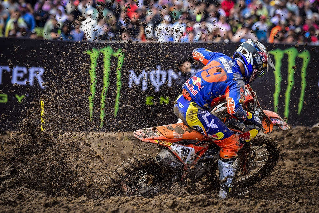 Tasting a chance to take on the World Champion, Valin crashed spectacularly on a downhill straight, and several laps later he was out with mechanical issues caused by the fall. This left Laengenfelder in second and Valk in a great third, but the conditions were causing problems for many machines, most notably for Red Bull KTM Factory Racing’s Andrea Adamo, who could say goodbye to his red plate after his machine stopped at the top of the furthest uphill from the paddock, not long after he had recovered from his poor start to push Guillem Farres for his fifth position.