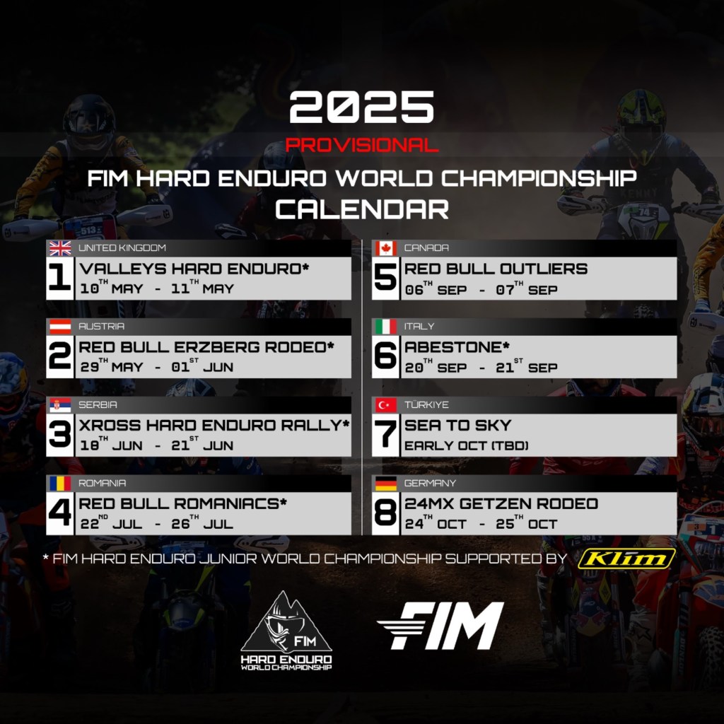 2025 Expotrade FIM Women’s Enduro World Championship Round 1: GP of Portugal – Fafe – 4-6 April Round 2: GP of Wales – Rhayader – 1-3 August Round 3: GP of France – Réquista – 12-14 September Round 4: GP of Germany – Zschopau – 17-19 October