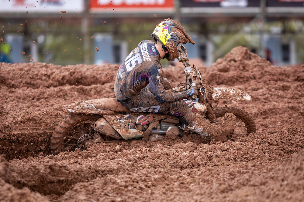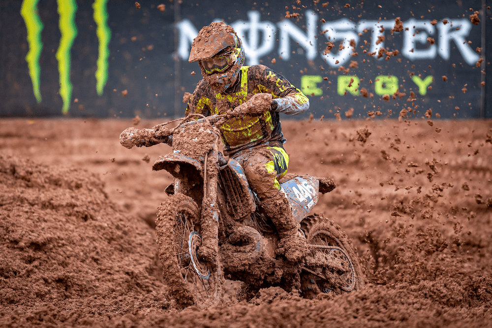As the race developed, Moto Bauerschmidt Husqvarna’s Mads Fredsoe executed a clean pass on Team VHR VRT Yamaha Official’s Ivano Van Erp to take fourth place, but it was Greutmann who emerged from nowhere to grab the race lead on lap 4 of 11. However, his time at the front was short-lived as he suffered a dramatic crash, launching over the handlebars and injuring his wrist. Meanwhile, Fantic Factory Racing EMX125’s Simone Mancini, a standout in the 125cc class last season, also had an off-track moment. Petit was also on the charge and mastered the mud to make his way up from 11th to 5th showing impressive skills along the way.
