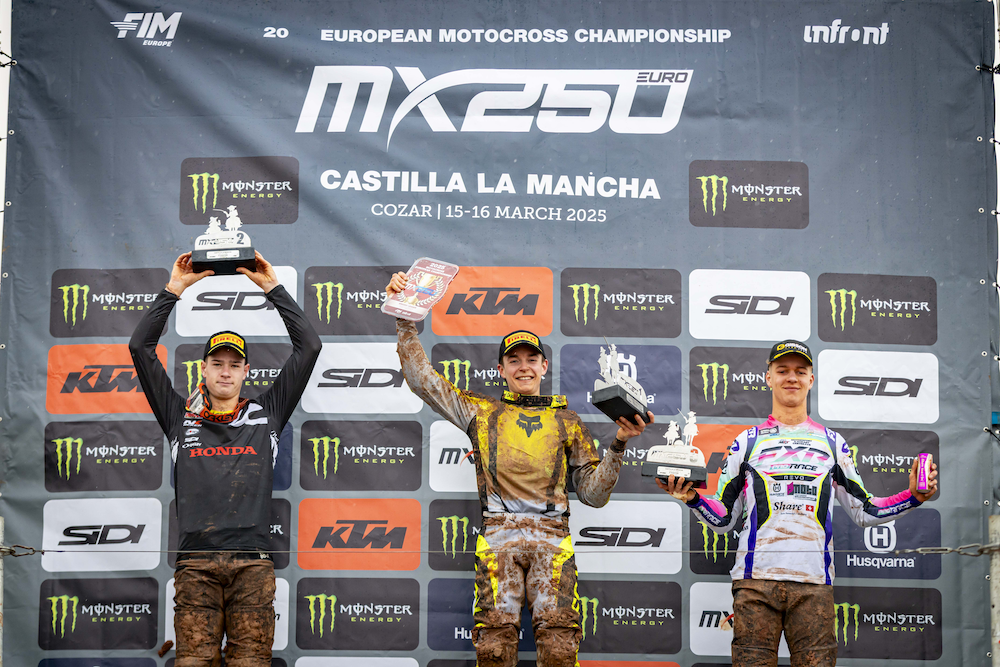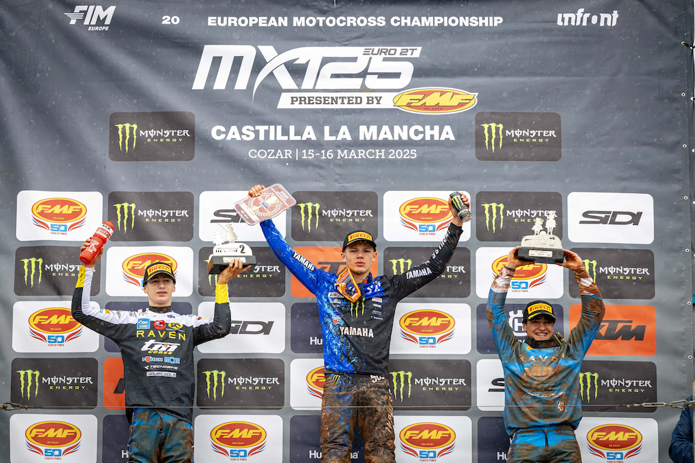 COZAR (Spain) 16 March 2025 – The first round of the EMX250 and EMX125 Presented by FMF Racing championships at the MXGP of Castilla La Mancha in Cozar delivered an action-packed start to the season. Riders battled the rain, wind and tough track to kick off their campaigns.