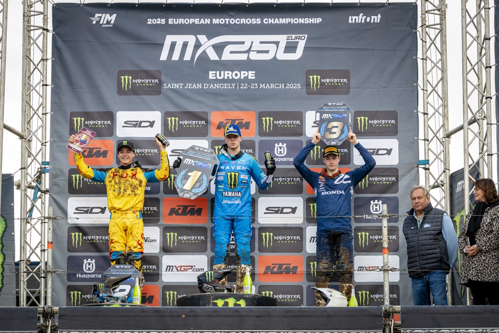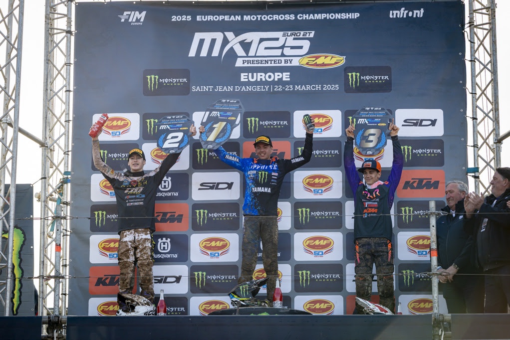 ST JEAN D’ANGELY (France) 23 March 2025 – The iconic hillside of St. Jean d’Angély hosted a spectacular second round of the FIM Europe EMX Championships series, and both EMX250 and EMX125 Presented by FMF Racingclasses delivered action-packed weekends that reshaped the title-race narrative.