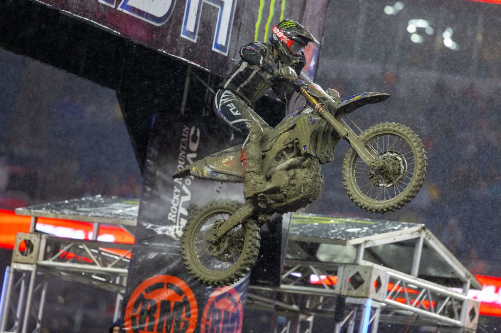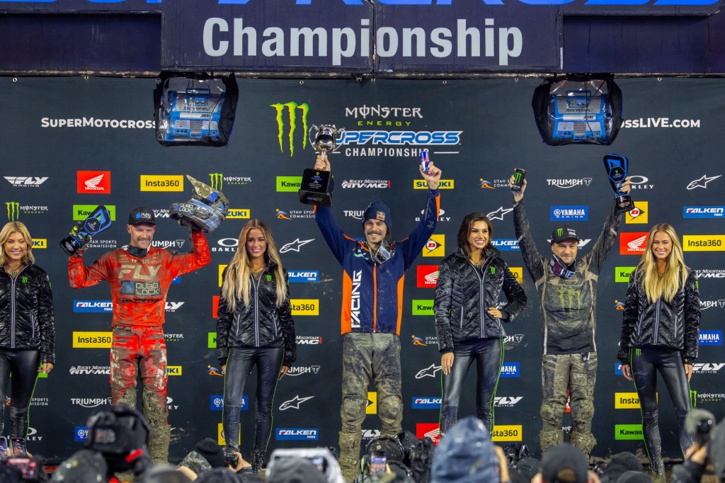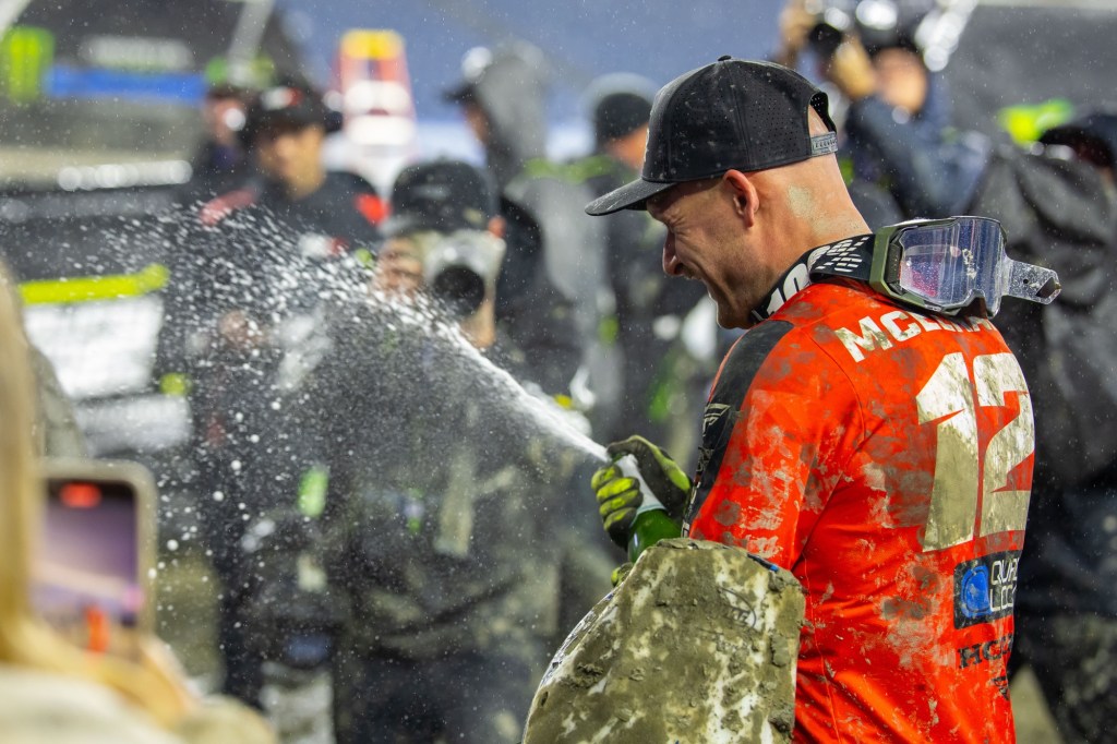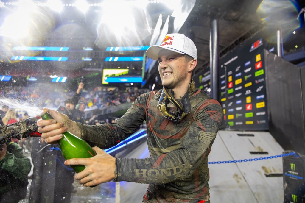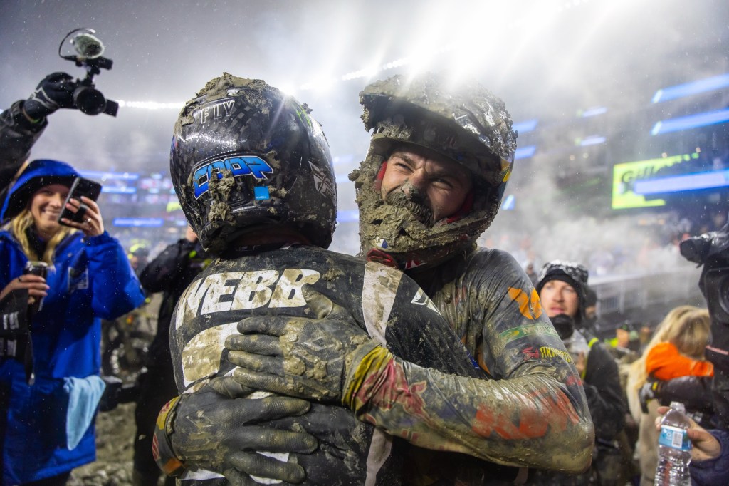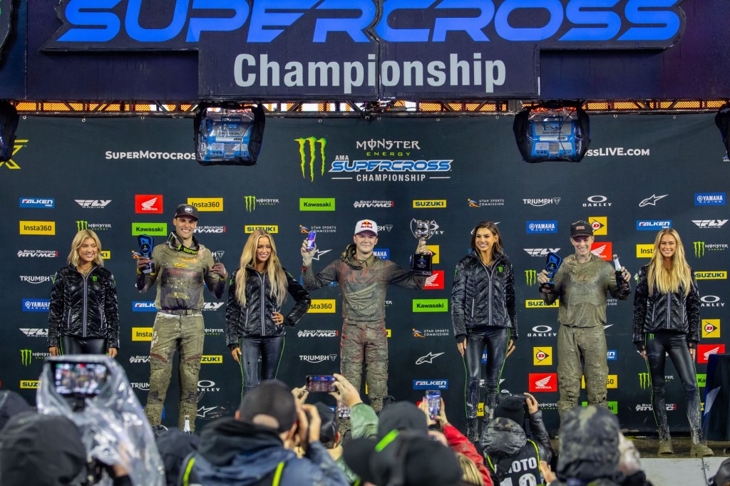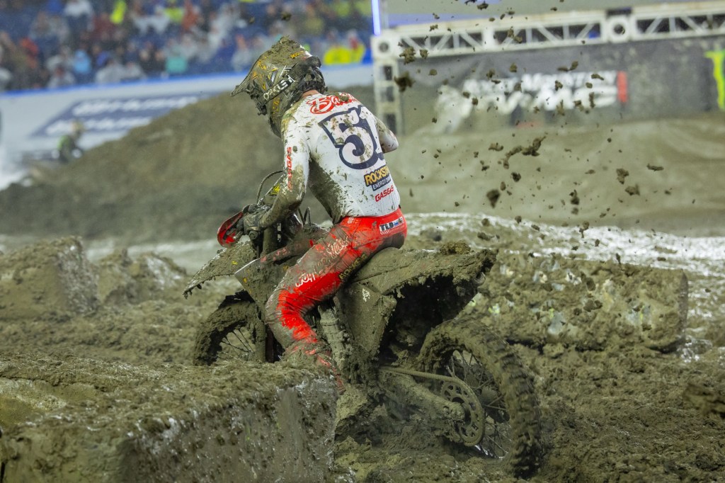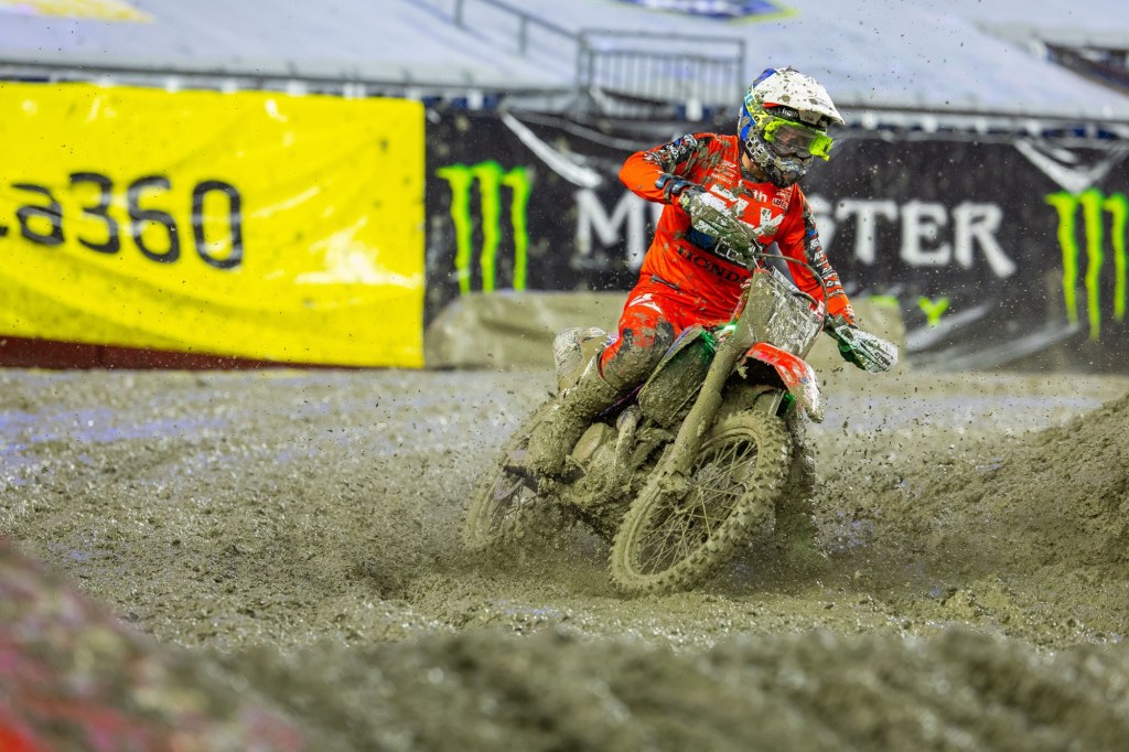 “In these kinds of conditions you don’t know what can happen. It’s so stressful when you’re leading the championship. You’re hoping your motorcycle makes it first of all, and then just getting into the Main you’re like, ‘All right I can breathe a little bit.’ These are bummer conditions. Nobody truly, I don’t think, wants to race in this unless you’re [Aaron Plessinger], maybe…. [Early on] I had a great pace… then I get excited, and I fall. So, I get up, and you kind of go into panic mode, and then you fall again. So, I fell twice and finally was like, ‘All right, I’m going to just calm down, I’ll take the points loss, but let’s minimize the points, let’s at least get as far up as we can.’ And that’s what happened. I shut my brain off and it’s crazy what happens. You start sending it, you start finding a flow. I don’t know what happened the last lap, I just jumped all the jumps, like my buddy says. It was cool. I’m stoked to be up here on the podium again.” – Cooper Webb