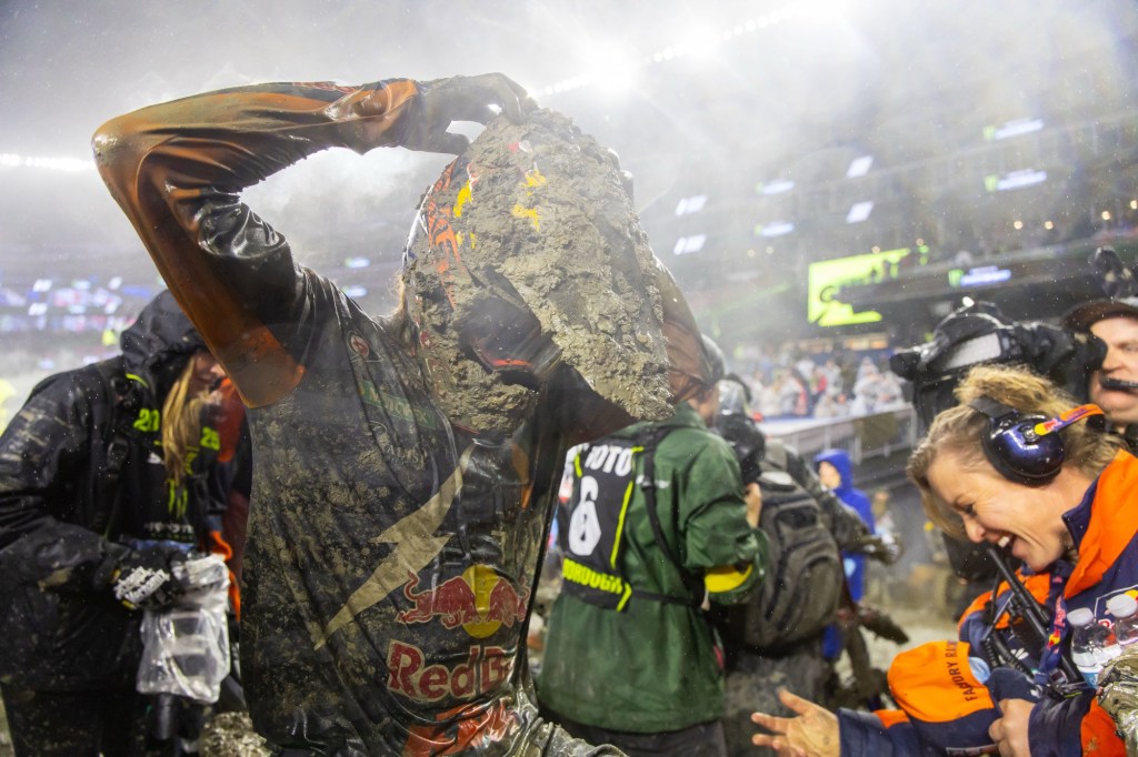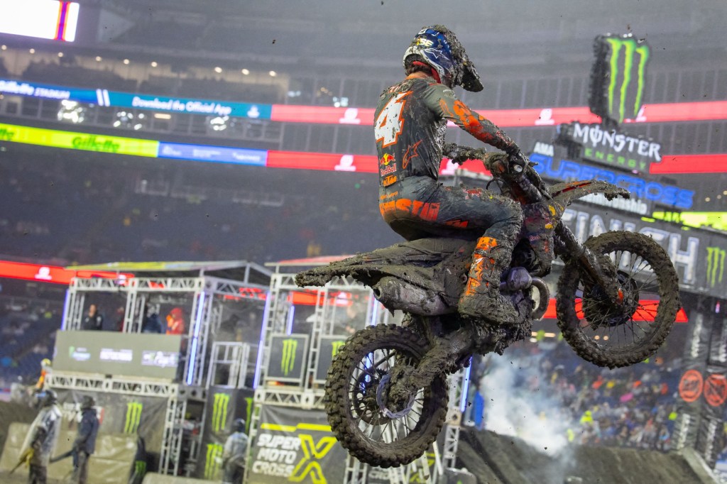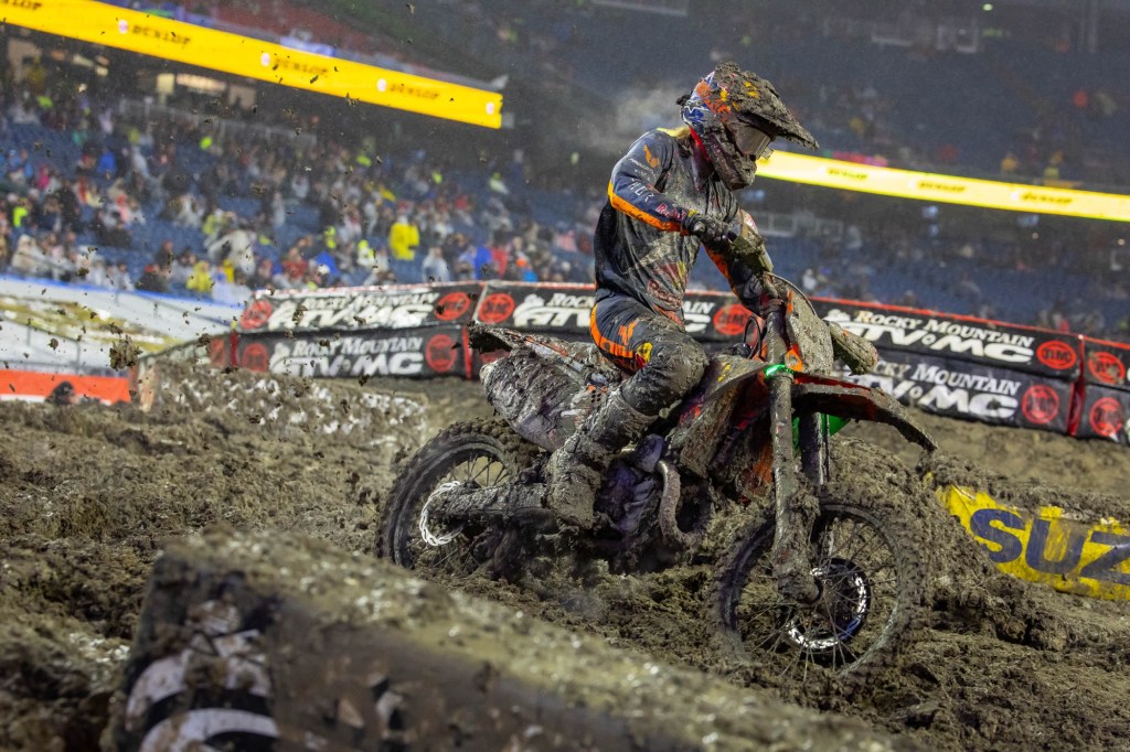 Foxborough, Mass., (April 6, 2025) Rain, cold weather, and wind turned the Foxborough Supercross into a race of survival of both man and machine. Red Bull KTM Factory Racing’s Aaron Plessinger was untouchable in the mud and took a convincing win in the abbreviated 12-minute plus one lap Main Event. It was Plessinger’s second-ever victory in the class.