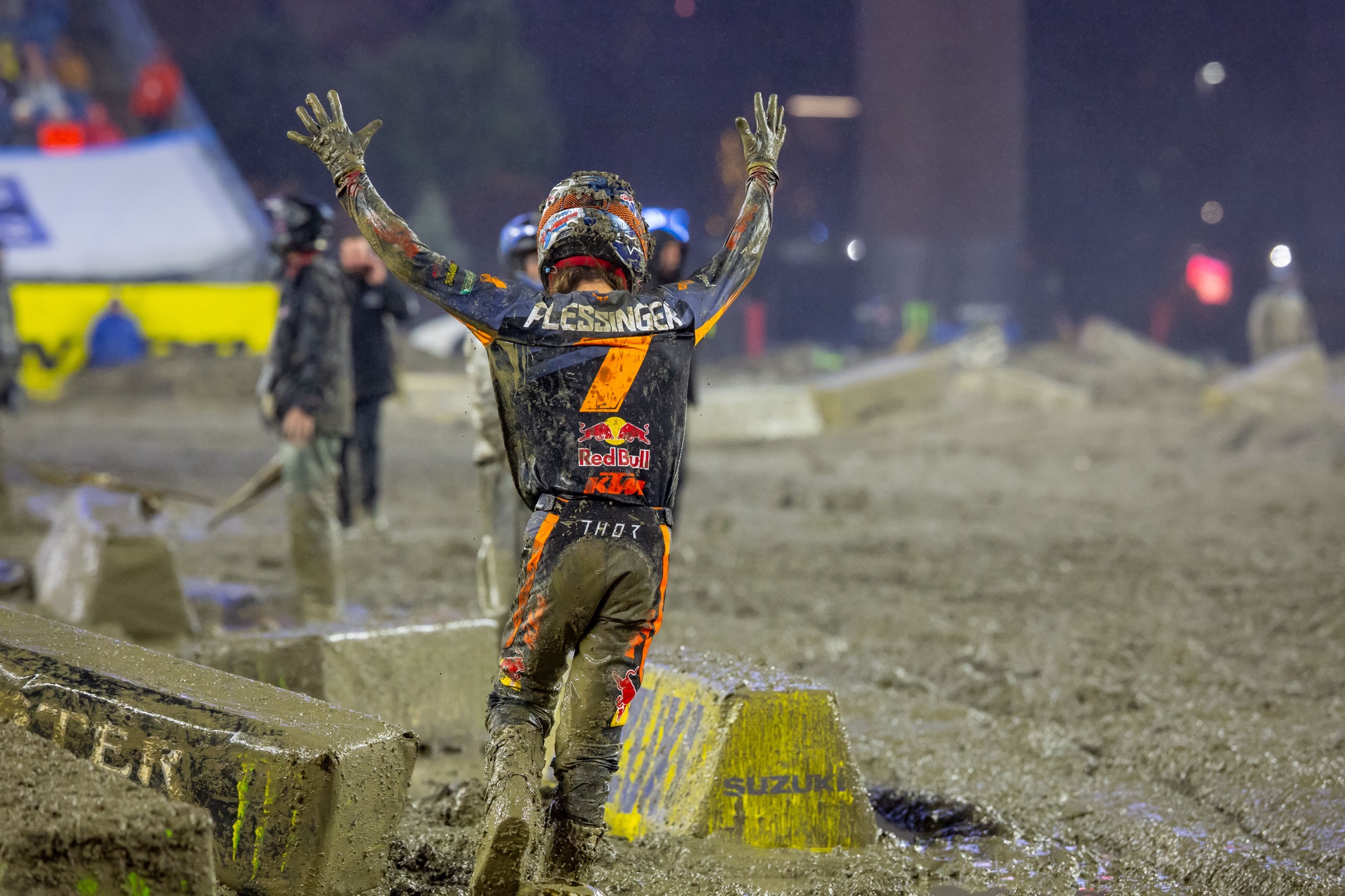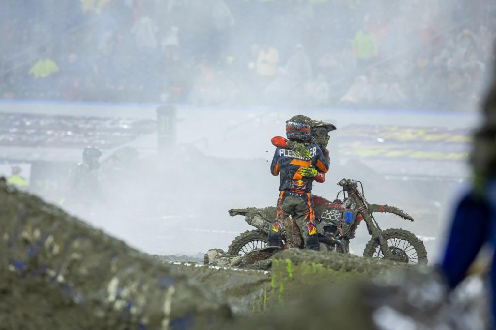 “When I got off to the start, I had Cooper [Webb] to the right of me and [Justin Cooper] in front of me; when they slowed down over here to go through the ruts I just stood up on the pegs, and just leaned back and pinned it. As soon as I got in the lead I knew I had to just ‘go’ and stay up, but I knew Shane was right there… It’s crazy. With how the season started I would have, man, I was sitting in California [during the early rounds] not two months ago and I was like, ‘What am I doing here? I don’t know what’s going on [with poor results].’ But I’ve just got to give it up to the whole team, Red Bull KTM Factory Racing, they never stopped believing in me. I’m kinda getting emotional, but it was a tough start to the season, and for these guys to stick behind me and not stop believing in me, that’s a lot for me to ask for. So, hat’s off to them… [Thank you to] these fans for sticking it out in the rain. I don’t know if I’m a fan of anything that I would stick out in pouring down rain for eight plus hours, but we’ve got the best fans in the world. The best fans ever in any sport, so I give it up to the fans, they had the best performance of the night.” – Aaron Plessinger