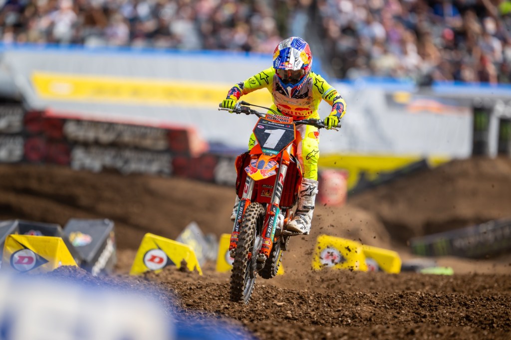 East Rutherford, N.J., (April 19, 2025) Red Bull KTM Factory Racing’s Chase Sexton took the Holeshot and left the field in his dust at Round 14 of the Monster Energy AMA Supercross season inside MetLife Stadium. Sexton stretched the lead past 18 seconds at one point. The win moved Sexton within nine points of the championship lead; a win in each of the three remaining rounds would assure Sexton the title.