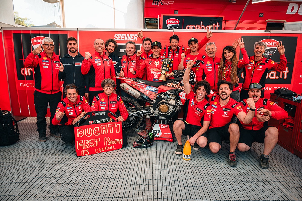 A historic day in Switzerland for Ducati Corse Off Road and the Aruba.it – Ducati Factory MX Team, as they celebrated their first-ever podium finish in the FIM Motocross MXGP World Championship. Swiss rider Jeremy Seewer, the 30-year-old from Bülach – just 30 kilometres from the Frauenfeld track – secured third place overall at the MXGP Grand Prix of Switzerland, the sixth round of the championship held across Saturday and Monday.