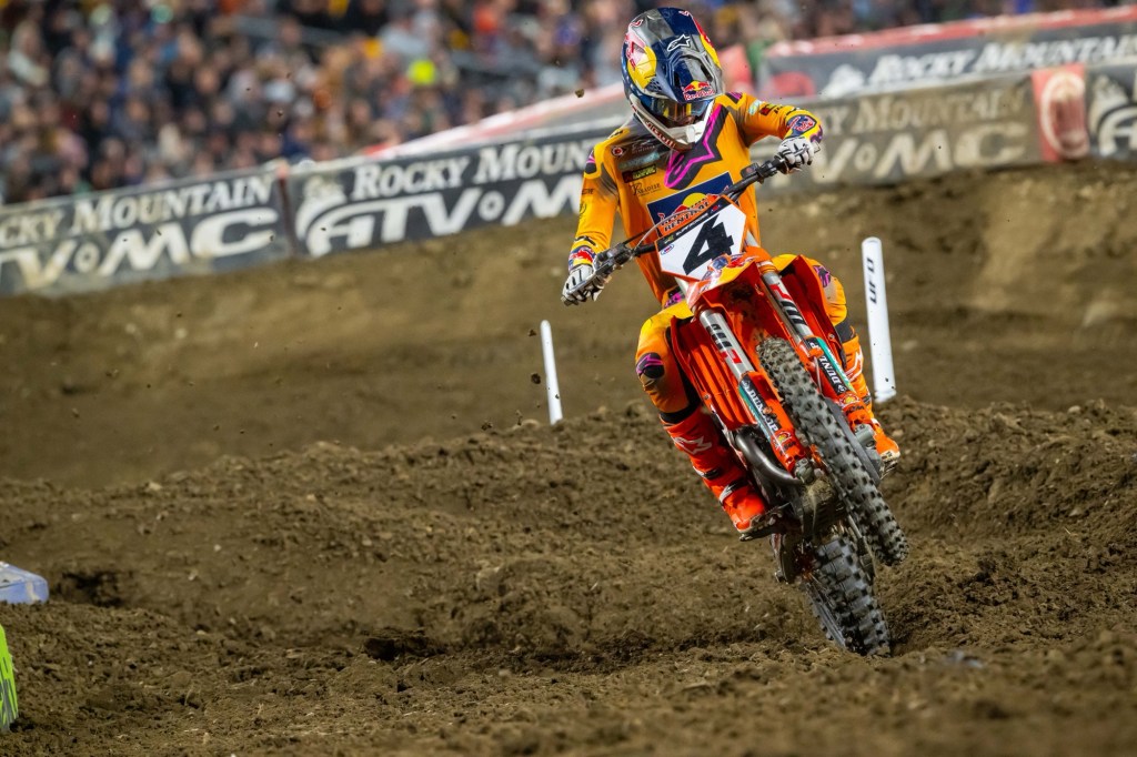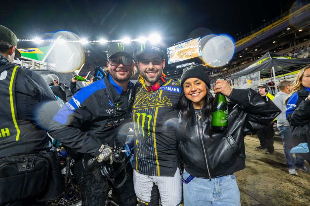 “[I felt] a little bit of everything, man. It’s been a heck of a fight, and a rough two weeks, especially last week. So, it was much needed tonight. It was an incredible main event. We were going for it and if I made one little mistake, I knew he was going to get me. So, you want to talk about pressure, that was a lot. I’m just stoked on myself to rebound after last week to pull the holeshot and lead every lap with that kind of pressure. Man, it’s not easy to do. I’m stoked for myself, and I’m stoked for my team. I want to give it up to them. We made a bike change this week that was awesome… Last weekend was pretty hard on me and it’s great to get back up here and get another win, get the ball rolling, obviously stop the momentum that Chase had a little bit. But he’s going to be firing. I know he’s a hellova competitor.” – Cooper Webb (#2 in photo), when asked what he was feeling after the win, whether it was exhaustion or relief.
