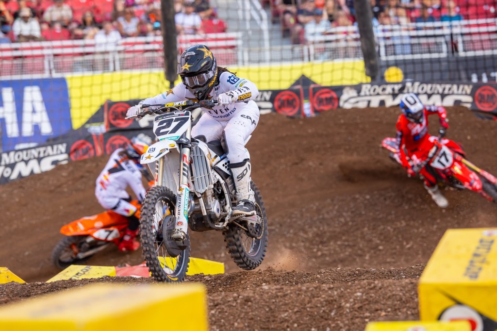 The Dave Coombs Sr. 250SX East/West Showdown became an instant classic for the battle over the Eastern Divisional 250SX Class title which had three riders separated by only three points. When the gate dropped Haiden Deegan rocketed into the lead and ran away with it. Tom Vialle sat in second with the other Eastern Divisional contenders, Monster Energy Pro Circuit Kawasaki’s Seth Hammaker, in fourth, and Rockstar Energy Husqvarna Factory Racing’s RJ Hampshire, in 14th. Along with Western Divisional rider Red Bull KTM Factory Racing’s Julien Beaumer, the four riders threw down for an epic battle that saw several position changes, aggressive passes, and a take-out move that put both Hampshire and Hammaker on the ground. That crash allowed Vialle to slip past and pull the championship back when it had appeared lost. Hammaker made a charge but could not regain the time lost to Vialle. At the checkered flag Deegan cruised to his fourth win, Beaumer took second, and Vialle took third place and secured the 250SX Eastern Divisional Championship.