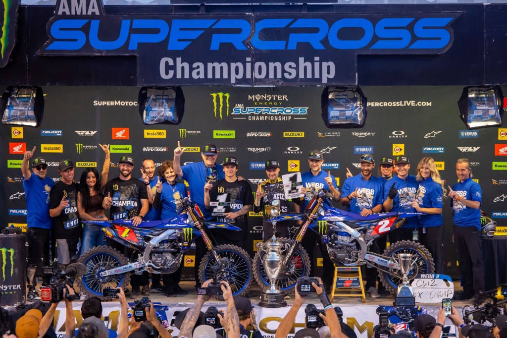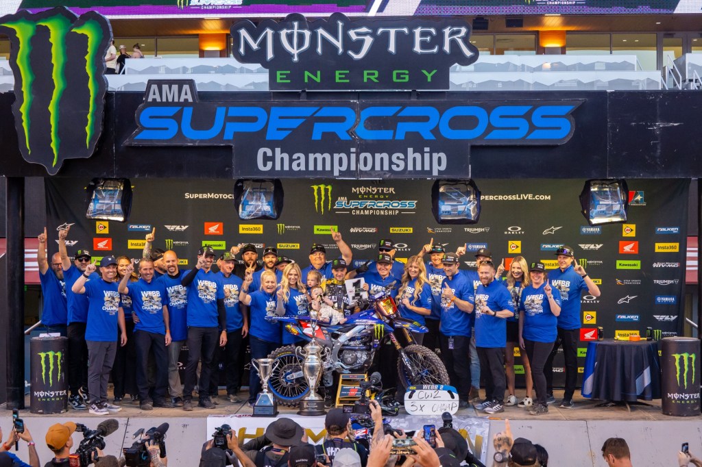 “[This third championship] means everything. You don’t know how many nights I’ve woken up just wanting to get this again. And I never thought I’d be here again, so never give up on yourself. Never cut yourself short. I’m not maybe the best, but man, when you put your mind to something [then] you get it done. I’ve got to give it up to the Good Lord, my wife, my family. Man, they push me to be the best every day. And Yamaha for giving me another opportunity; I knew I wasn’t done after those two [championships]. It feels freakin’ awesome, man. I just couldn’t do it without everyone involved, the whole Star team… I wasn’t supposed to line up this January [due to injury] and I did and here we are. It means the world. This may never happen again so I’m going to enjoy the [heck] out of it. Thank you to all these fans, great team, teammates, everyone. It’s just a relief. Never give up on yourself, kids!” – Cooper Webb (with members of the Monster Energy Yamaha Star Racing team)
