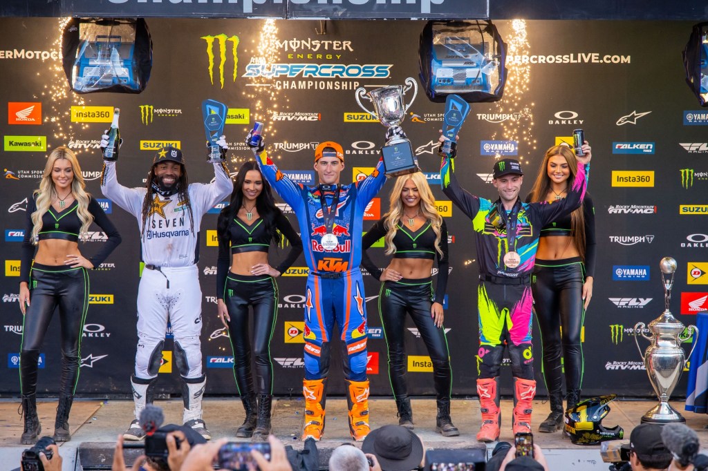 “It was awesome. Of course, huge shout out to Cooper Webb. Winning the championship three times, that’s awesome. That a big accomplishment. And for me, Salt Lake City, I don’t know why, the fans just hype me up. I knew I had to give it everything I had. I wanted to get back up on the box. Last weekend stung a little bit, so I’m like, ‘You know what, I’m giving it everything I’ve got. This is the last race, round 17, so we’re going to give it everything we’ve got.’ And huge shout out the Rockstar Husqvarna group, my mom and dad, and I know my brother’s watching in the [broadcast] booth… It’s been one heck of a season and I’m so proud and thankful that I’ve been able to get up here another time, and like I said, [the] fans are awesome… [when asked what he said to Cooper Webb after the race] We keep that confidential. We don’t forget where we came from and at the end of the day he’s done a phenomenal job, so I’m going to keep it there.” – Malcolm Stewart