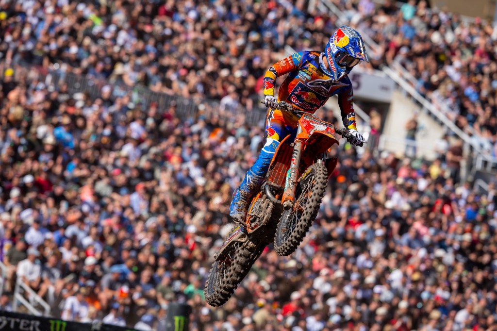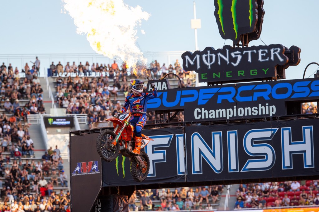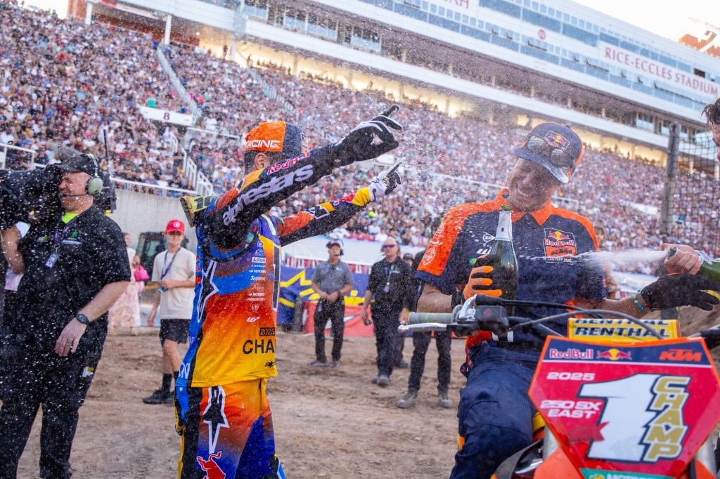 Salt Lake City, Utah, (May 11, 2025) Red Bull KTM Factory Racing’s Chase Sexton grabbed his seventh win of the season with a statement ride inside Rice-Eccles Stadium at the final round of the 2025 Monster Energy AMA Supercross Championship. Sexton elected to pull clear of the pack and dominate the race rather than employ tactics in an attempt to impact the points. Monster Energy Yamaha Star Racing’s Cooper Webb took over the lead on the opening lap but eventually fell back to fourth place in a points preservation ride. Webb’s finish earned him enough points to win the 2025 Monster Energy AMA Supercross Championship and enter the short list of just seven riders who have three or more premier class Supercross titles.